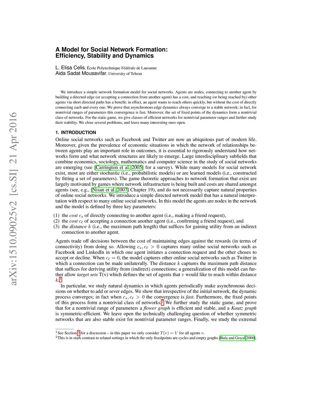 We introduce a simple network formation model for social networks. Agents are nodes, connecting to another agent by building a directed edge (or accepting a connection from another agent) has a cost, and reaching (or being reached by) other agents via short directed paths has a benefit; in effect, an agent wants to reach others quickly, but without the cost of directly connecting each and every one. We prove that asynchronous edge dynamics always converge to a stable network; in fact, for nontrivial ranges of parameters this convergence is fast. Moreover, the set of fixed points of the dynamics form a nontrivial class of networks. For the static game, we give classes of efficient networks for nontrivial parameter ranges and further study their stability. We close several problems, and leave many interesting ones open.