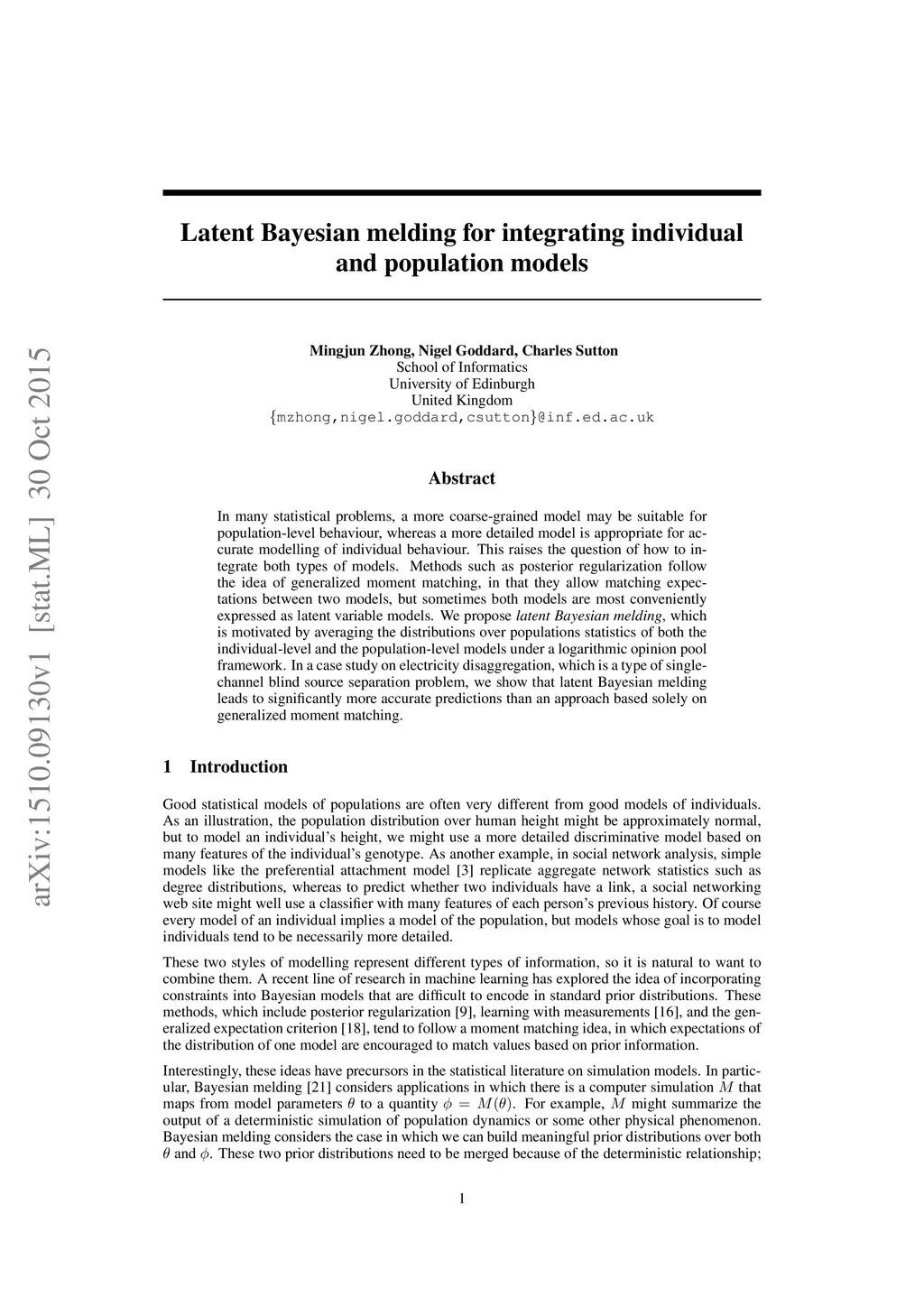 In many statistical problems, a more coarse-grained model may be suitable for population-level behaviour, whereas a more detailed model is appropriate for accurate modelling of individual behaviour. This raises the question of how to integrate both types of models. Methods such as posterior regularization follow the idea of generalized moment matching, in that they allow matching expectations between two models, but sometimes both models are most conveniently expressed as latent variable models. We propose latent Bayesian melding, which is motivated by averaging the distributions over populations statistics of both the individual-level and the population-level models under a logarithmic opinion pool framework. In a case study on electricity disaggregation, which is a type of single-channel blind source separation problem, we show that latent Bayesian melding leads to significantly more accurate predictions than an approach based solely on generalized moment matching.