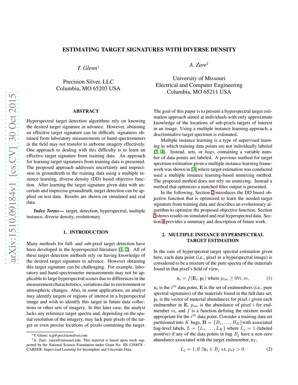 Hyperspectral target detection algorithms rely on knowing the desired target signature in advance. However, obtaining an effective target signature can be difficult; signatures obtained from laboratory measurements or hand-spectrometers in the field may not transfer to airborne imagery effectively. One approach to dealing with this difficulty is to learn an effective target signature from training data. An approach for learning target signatures from training data is presented. The proposed approach addresses uncertainty and imprecision in groundtruth in the training data using a multiple instance learning, diverse density (DD) based objective function. After learning the target signature given data with uncertain and imprecise groundtruth, target detection can be applied on test data. Results are shown on simulated and real data.