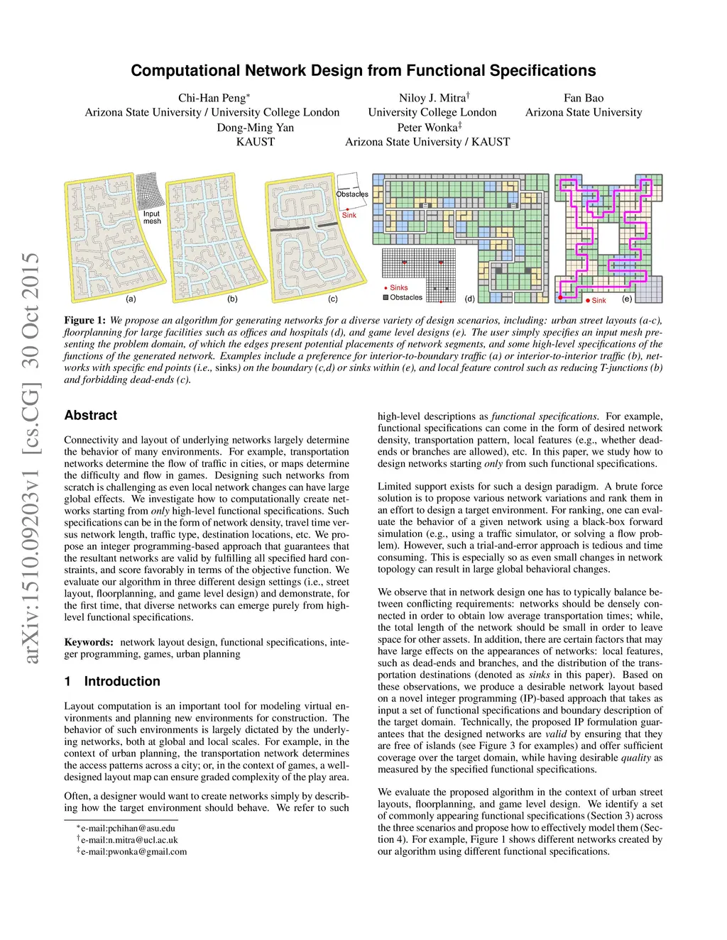 Connectivity and layout of underlying networks largely determine the behavior of many environments. For example, transportation networks determine the flow of traffic in cities, or maps determine the difficulty and flow in games. Designing such networks from scratch is challenging as even local network changes can have large global effects. We investigate how to computationally create networks starting from {\em only} high-level functional specifications. Such specifications can be in the form of network density, travel time versus network length, traffic type, destination locations, etc. We propose an integer programming-based approach that guarantees that the resultant networks are valid by fulfilling all specified hard constraints, and score favorably in terms of the objective function. We evaluate our algorithm in three different design settings (i.e., street layout, floorplanning, and game level design) and demonstrate, for the first time, that diverse networks can emerge purely from high-level functional specifications.