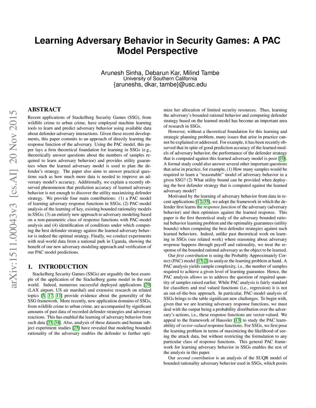 Learning Adversary Behavior in Security Games: A PAC Model Perspective