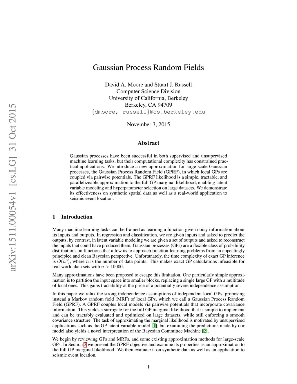 Gaussian processes have been successful in both supervised and unsupervised machine learning tasks, but their computational complexity has constrained practical applications. We introduce a new approximation for large-scale Gaussian processes, the Gaussian Process Random Field (GPRF), in which local GPs are coupled via pairwise potentials. The GPRF likelihood is a simple, tractable, and parallelizeable approximation to the full GP marginal likelihood, enabling latent variable modeling and hyperparameter selection on large datasets. We demonstrate its effectiveness on synthetic spatial data as well as a real-world application to seismic event location.