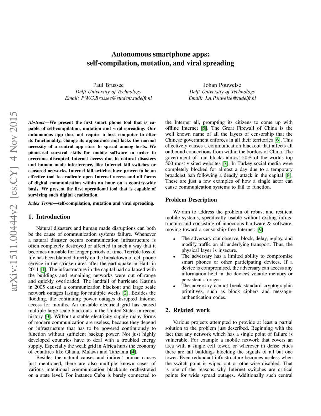 We present the first smart phone tool that is capable of self-compilation, mutation and viral spreading. Our autonomous app does not require a host computer to alter its functionality, change its appearance and lacks the normal necessity of a central app store to spread among hosts. We pioneered survival skills for mobile software in order to overcome disrupted Internet access due to natural disasters and human made interference, like Internet kill switches or censored networks. Internet kill switches have proven to be an effective tool to eradicate open Internet access and all forms of digital communication within an hour on a country-wide basis. We present the first operational tool that is capable of surviving such digital eradication.