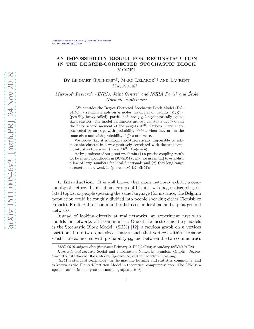 We consider the Degree-Corrected Stochastic Block Model (DC-SBM): a random graph on nodes, having i.i.d. weights (possibly heavy-tailed), partitioned into asymptotically equal-sized clusters. The model parameters are two constants and the finite second moment of the weights . Vertices and are connected by an edge with probability when they are in the same class and with probability otherwise. We prove that it is information-theoretically impossible to estimate the clusters in a way positively correlated with the true community structure when . As by-products of our proof we obtain a precise coupling result for local neighbourhoods in DC-SBM's, that we use in a follow up paper [Gulikers et al., 2017] to establish a law of large numbers for local-functionals and that long-range interactions are weak in (power-law) DC-SBM's.