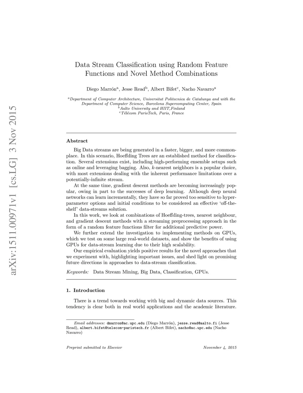 Big Data streams are being generated in a faster, bigger, and more commonplace. In this scenario, Hoeffding Trees are an established method for classification. Several extensions exist, including high-performing ensemble setups such as online and leveraging bagging. Also, -nearest neighbors is a popular choice, with most extensions dealing with the inherent performance limitations over a potentially-infinite stream. At the same time, gradient descent methods are becoming increasingly popular, owing in part to the successes of deep learning. Although deep neural networks can learn incrementally, they have so far proved too sensitive to hyper-parameter options and initial conditions to be considered an effective `off-the-shelf' data-streams solution. In this work, we look at combinations of Hoeffding-trees, nearest neighbour, and gradient descent methods with a streaming preprocessing approach in the form of a random feature functions filter for additional predictive power. We further extend the investigation to implementing methods on GPUs, which we test on some large real-world datasets, and show the benefits of using GPUs for data-stream learning due to their high scalability. Our empirical evaluation yields positive results for the novel approaches that we experiment with, highlighting important issues, and shed light on promising future directions in approaches to data-stream classification.