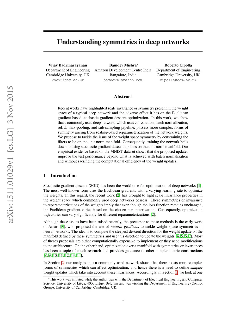 Recent works have highlighted scale invariance or symmetry present in the weight space of a typical deep network and the adverse effect it has on the Euclidean gradient based stochastic gradient descent optimization. In this work, we show that a commonly used deep network, which uses convolution, batch normalization, reLU, max-pooling, and sub-sampling pipeline, possess more complex forms of symmetry arising from scaling-based reparameterization of the network weights. We propose to tackle the issue of the weight space symmetry by constraining the filters to lie on the unit-norm manifold. Consequently, training the network boils down to using stochastic gradient descent updates on the unit-norm manifold. Our empirical evidence based on the MNIST dataset shows that the proposed updates improve the test performance beyond what is achieved with batch normalization and without sacrificing the computational efficiency of the weight updates.