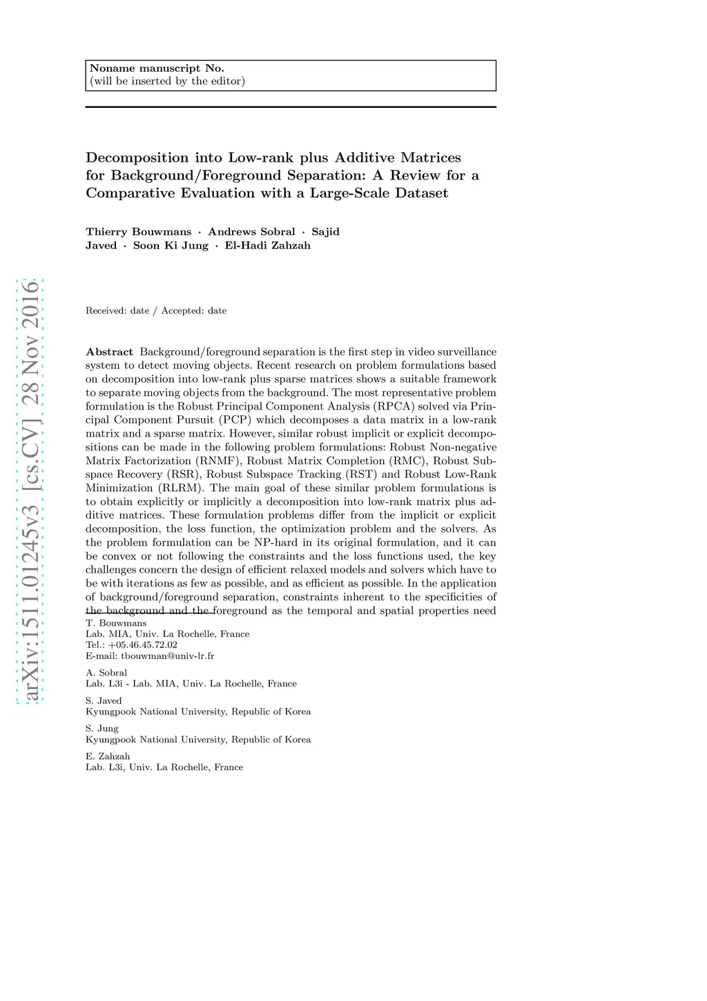 Recent research on problem formulations based on decomposition into low-rank plus sparse matrices shows a suitable framework to separate moving objects from the background. The most representative problem formulation is the Robust Principal Component Analysis (RPCA) solved via Principal Component Pursuit (PCP) which decomposes a data matrix in a low-rank matrix and a sparse matrix. However, similar robust implicit or explicit decompositions can be made in the following problem formulations: Robust Non-negative Matrix Factorization (RNMF), Robust Matrix Completion (RMC), Robust Subspace Recovery (RSR), Robust Subspace Tracking (RST) and Robust Low-Rank Minimization (RLRM). The main goal of these similar problem formulations is to obtain explicitly or implicitly a decomposition into low-rank matrix plus additive matrices. In this context, this work aims to initiate a rigorous and comprehensive review of the similar problem formulations in robust subspace learning and tracking based on decomposition into low-rank plus additive matrices for testing and ranking existing algorithms for background/foreground separation. For this, we first provide a preliminary review of the recent developments in the different problem formulations which allows us to define a unified view that we called Decomposition into Low-rank plus Additive Matrices (DLAM). Then, we examine carefully each method in each robust subspace learning/tracking frameworks with their decomposition, their loss functions, their optimization problem and their solvers. Furthermore, we investigate if incremental algorithms and real-time implementations can be achieved for background/foreground separation. Finally, experimental results on a large-scale dataset called Background Models Challenge (BMC 2012) show the comparative performance of 32 different robust subspace learning/tracking methods.
