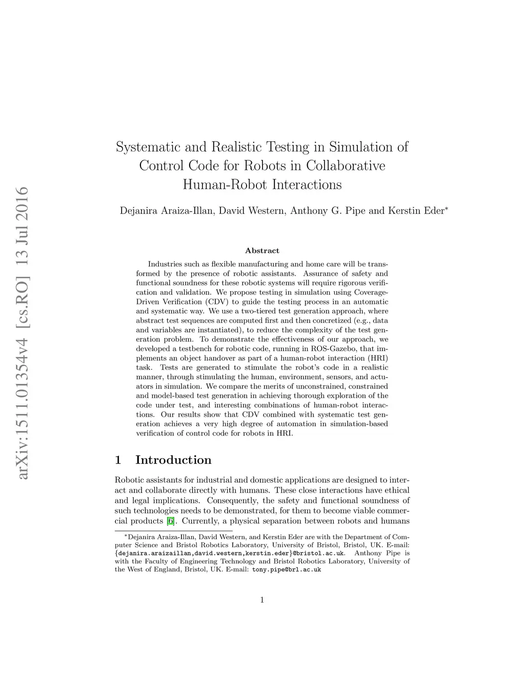 Industries such as flexible manufacturing and home care will be transformed by the presence of robotic assistants. Assurance of safety and functional soundness for these robotic systems will require rigorous verification and validation. We propose testing in simulation using Coverage-Driven Verification (CDV) to guide the testing process in an automatic and systematic way. We use a two-tiered test generation approach, where abstract test sequences are computed first and then concretized (e.g., data and variables are instantiated), to reduce the complexity of the test generation problem. To demonstrate the effectiveness of our approach, we developed a testbench for robotic code, running in ROS-Gazebo, that implements an object handover as part of a human-robot interaction (HRI) task. Tests are generated to stimulate the robot's code in a realistic manner, through stimulating the human, environment, sensors, and actuators in simulation. We compare the merits of unconstrained, constrained and model-based test generation in achieving thorough exploration of the code under test, and interesting combinations of human-robot interactions. Our results show that CDV combined with systematic test generation achieves a very high degree of automation in simulation-based verification of control code for robots in HRI.