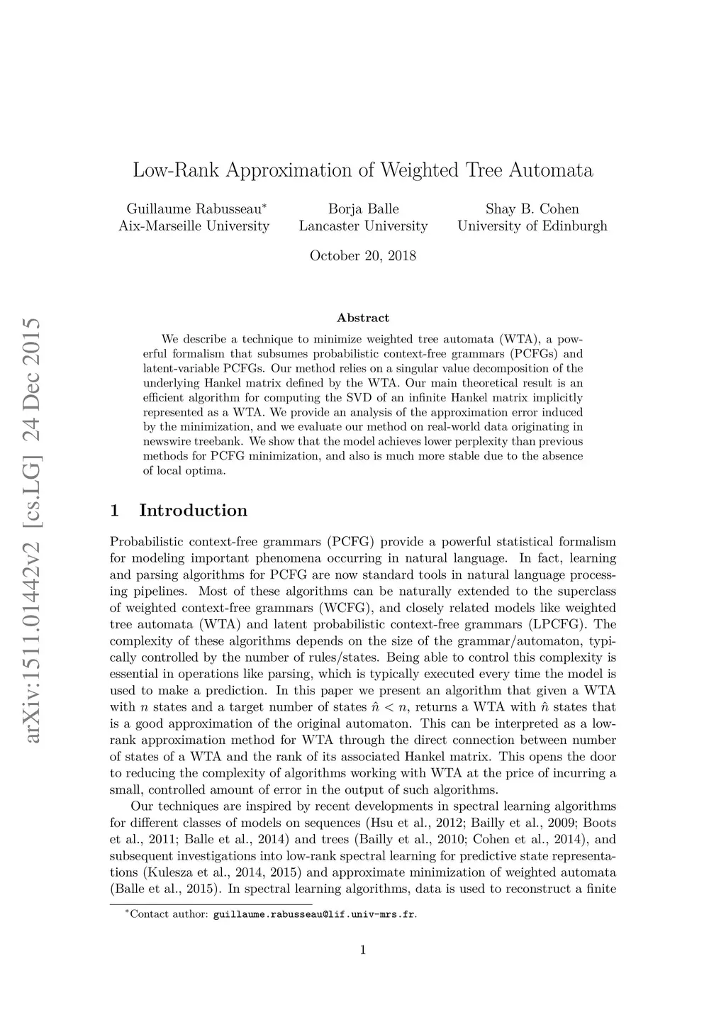 We describe a technique to minimize weighted tree automata (WTA), a powerful formalisms that subsumes probabilistic context-free grammars (PCFGs) and latent-variable PCFGs. Our method relies on a singular value decomposition of the underlying Hankel matrix defined by the WTA. Our main theoretical result is an efficient algorithm for computing the SVD of an infinite Hankel matrix implicitly represented as a WTA. We provide an analysis of the approximation error induced by the minimization, and we evaluate our method on real-world data originating in newswire treebank. We show that the model achieves lower perplexity than previous methods for PCFG minimization, and also is much more stable due to the absence of local optima.
