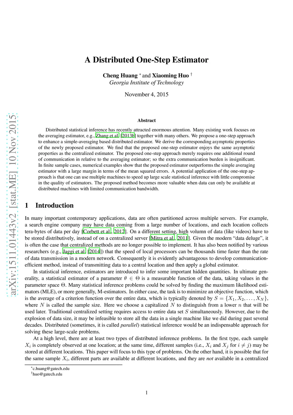 Distributed statistical inference has recently attracted enormous attention. Many existing work focuses on the averaging estimator. We propose a one-step approach to enhance a simple-averaging based distributed estimator. We derive the corresponding asymptotic properties of the newly proposed estimator. We find that the proposed one-step estimator enjoys the same asymptotic properties as the centralized estimator. The proposed one-step approach merely requires one additional round of communication in relative to the averaging estimator; so the extra communication burden is insignificant. In finite sample cases, numerical examples show that the proposed estimator outperforms the simple averaging estimator with a large margin in terms of the mean squared errors. A potential application of the one-step approach is that one can use multiple machines to speed up large scale statistical inference with little compromise in the quality of estimators. The proposed method becomes more valuable when data can only be available at distributed machines with limited communication bandwidth.