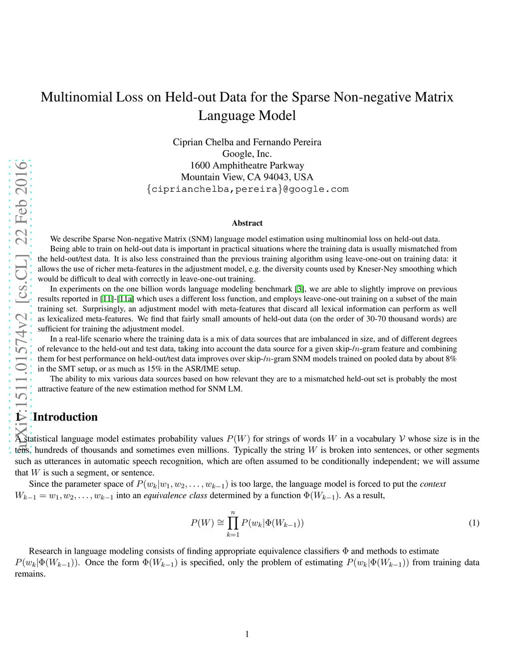 We describe Sparse Non-negative Matrix (SNM) language model estimation using multinomial loss on held-out data. Being able to train on held-out data is important in practical situations where the training data is usually mismatched from the held-out/test data. It is also less constrained than the previous training algorithm using leave-one-out on training data: it allows the use of richer meta-features in the adjustment model, e.g. the diversity counts used by Kneser-Ney smoothing which would be difficult to deal with correctly in leave-one-out training. In experiments on the one billion words language modeling benchmark, we are able to slightly improve on our previous results which use a different loss function, and employ leave-one-out training on a subset of the main training set. Surprisingly, an adjustment model with meta-features that discard all lexical information can perform as well as lexicalized meta-features. We find that fairly small amounts of held-out data (on the order of 30-70 thousand words) are sufficient for training the adjustment model. In a real-life scenario where the training data is a mix of data sources that are imbalanced in size, and of different degrees of relevance to the held-out and test data, taking into account the data source for a given skip-/n-gram feature and combining them for best performance on held-out/test data improves over skip-/n-gram SNM models trained on pooled data by about 8% in the SMT setup, or as much as 15% in the ASR/IME setup. The ability to mix various data sources based on how relevant they are to a mismatched held-out set is probably the most attractive feature of the new estimation method for SNM LM.