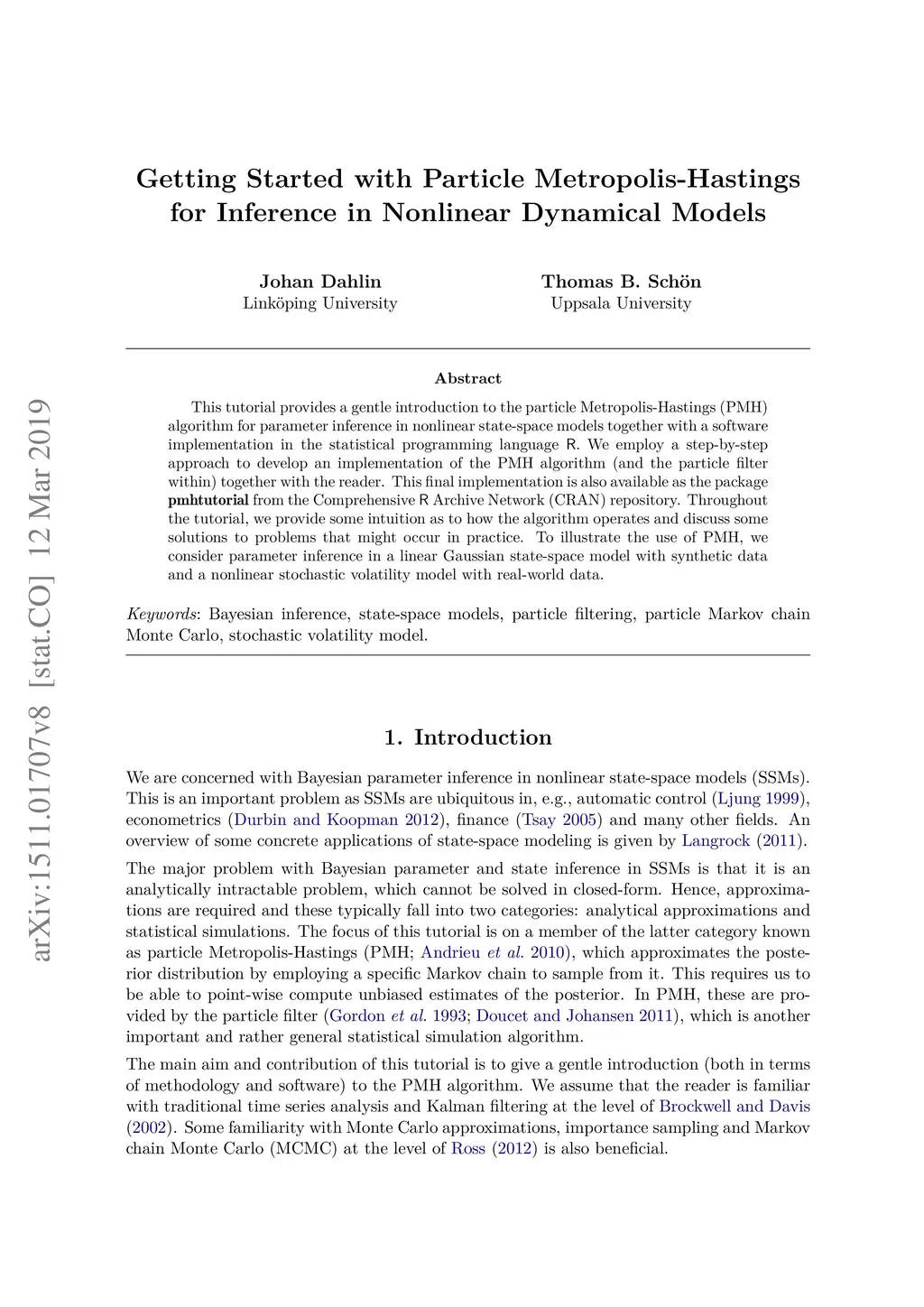 This tutorial provides a gentle introduction to the particle Metropolis-Hastings (PMH) algorithm for parameter inference in nonlinear state-space models together with a software implementation in the statistical programming language R. We employ a step-by-step approach to develop an implementation of the PMH algorithm (and the particle filter within) together with the reader. This final implementation is also available as the package pmhtutorial in the CRAN repository. Throughout the tutorial, we provide some intuition as to how the algorithm operates and discuss some solutions to problems that might occur in practice. To illustrate the use of PMH, we consider parameter inference in a linear Gaussian state-space model with synthetic data and a nonlinear stochastic volatility model with real-world data.