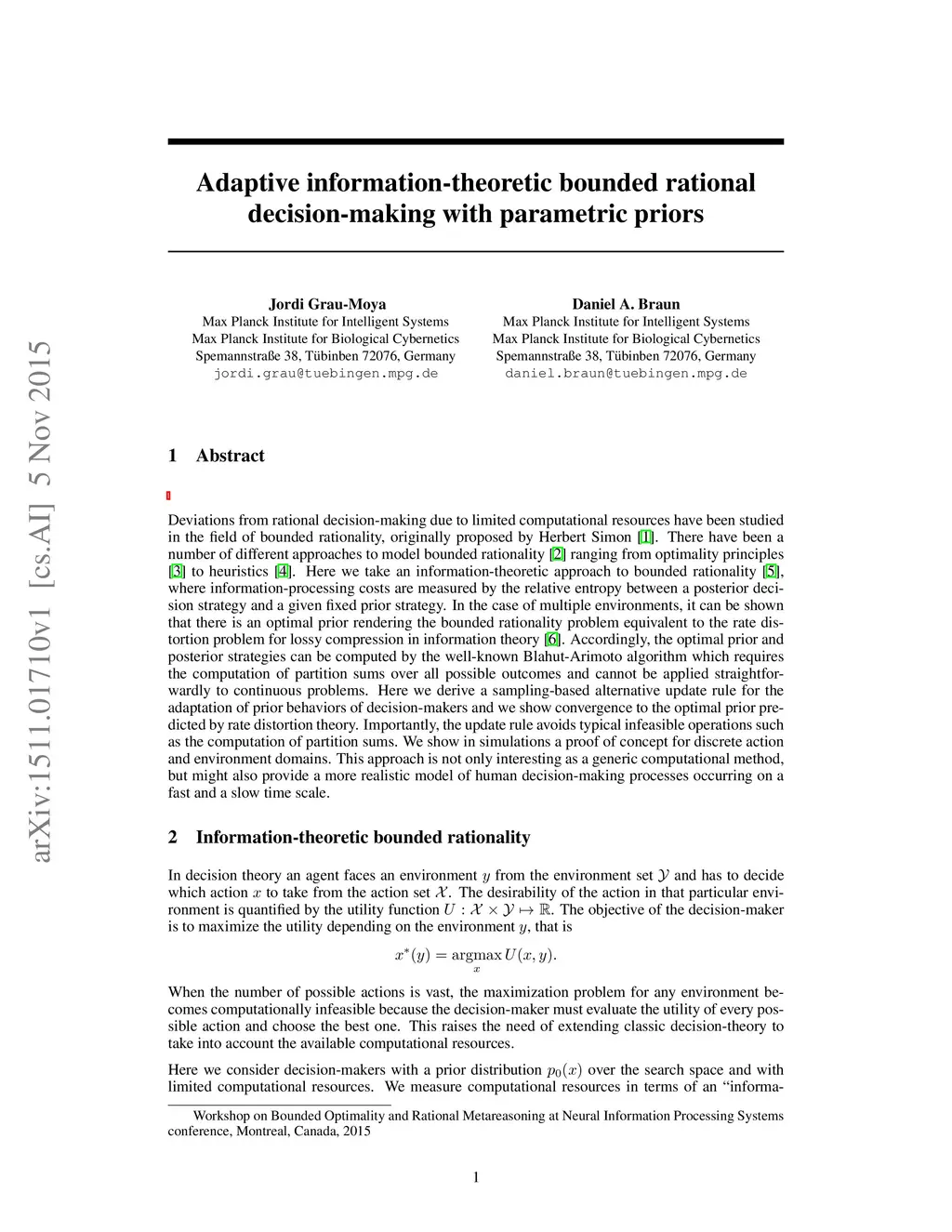 Deviations from rational decision-making due to limited computational resources have been studied in the field of bounded rationality, originally proposed by Herbert Simon. There have been a number of different approaches to model bounded rationality ranging from optimality principles to heuristics. Here we take an information-theoretic approach to bounded rationality, where information-processing costs are measured by the relative entropy between a posterior decision strategy and a given fixed prior strategy. In the case of multiple environments, it can be shown that there is an optimal prior rendering the bounded rationality problem equivalent to the rate distortion problem for lossy compression in information theory. Accordingly, the optimal prior and posterior strategies can be computed by the well-known Blahut-Arimoto algorithm which requires the computation of partition sums over all possible outcomes and cannot be applied straightforwardly to continuous problems. Here we derive a sampling-based alternative update rule for the adaptation of prior behaviors of decision-makers and we show convergence to the optimal prior predicted by rate distortion theory. Importantly, the update rule avoids typical infeasible operations such as the computation of partition sums. We show in simulations a proof of concept for discrete action and environment domains. This approach is not only interesting as a generic computational method, but might also provide a more realistic model of human decision-making processes occurring on a fast and a slow time scale.