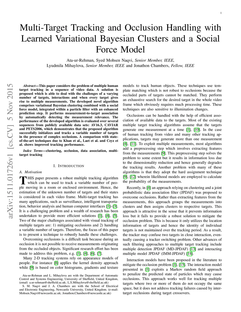 This paper considers the problem of multiple human target tracking in a sequence of video data. A solution is proposed which is able to deal with the challenges of a varying number of targets, interactions and when every target gives rise to multiple measurements. The developed novel algorithm comprises variational Bayesian clustering combined with a social force model, integrated within a particle filter with an enhanced prediction step. It performs measurement-to-target association by automatically detecting the measurement relevance. The performance of the developed algorithm is evaluated over several sequences from publicly available data sets: AV16.3, CAVIAR and PETS2006, which demonstrates that the proposed algorithm successfully initializes and tracks a variable number of targets in the presence of complex occlusions. A comparison with state-of-the-art techniques due to Khan et al., Laet et al. and Czyz et al. shows improved tracking performance.