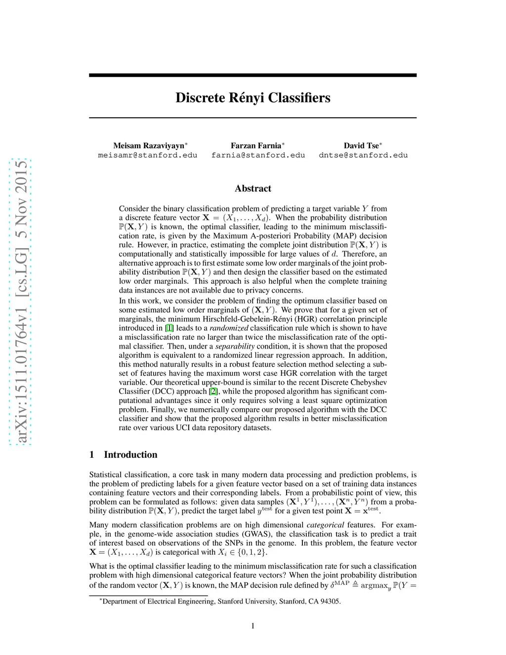 Consider the binary classification problem of predicting a target variable from a discrete feature vector . When the probability distribution is known, the optimal classifier, leading to the minimum misclassification rate, is given by the Maximum A-posteriori Probability decision rule. However, estimating the complete joint distribution is computationally and statistically impossible for large values of . An alternative approach is to first estimate some low order marginals of and then design the classifier based on the estimated low order marginals. This approach is also helpful when the complete training data instances are not available due to privacy concerns. In this work, we consider the problem of finding the optimum classifier based on some estimated low order marginals of . We prove that for a given set of marginals, the minimum Hirschfeld-Gebelein-Renyi (HGR) correlation principle introduced in [1] leads to a randomized classification rule which is shown to have a misclassification rate no larger than twice the misclassification rate of the optimal classifier. Then, under a separability condition, we show that the proposed algorithm is equivalent to a randomized linear regression approach. In addition, this method naturally results in a robust feature selection method selecting a subset of features having the maximum worst case HGR correlation with the target variable. Our theoretical upper-bound is similar to the recent Discrete Chebyshev Classifier (DCC) approach [2], while the proposed algorithm has significant computational advantages since it only requires solving a least square optimization problem. Finally, we numerically compare our proposed algorithm with the DCC classifier and show that the proposed algorithm results in better misclassification rate over various datasets.