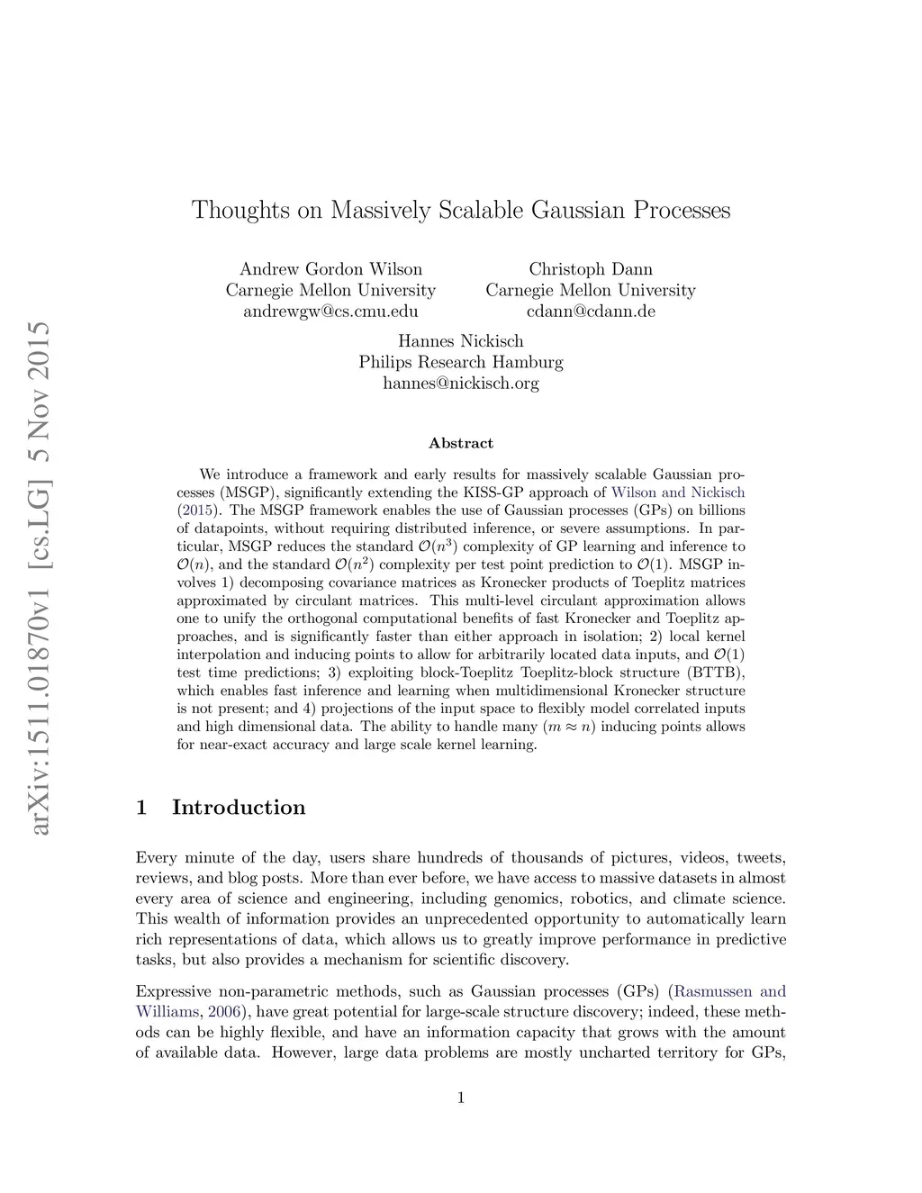 We introduce a framework and early results for massively scalable Gaussian processes (MSGP), significantly extending the KISS-GP approach of Wilson and Nickisch (2015). The MSGP framework enables the use of Gaussian processes (GPs) on billions of datapoints, without requiring distributed inference, or severe assumptions. In particular, MSGP reduces the standard complexity of GP learning and inference to , and the standard complexity per test point prediction to . MSGP involves 1) decomposing covariance matrices as Kronecker products of Toeplitz matrices approximated by circulant matrices. This multi-level circulant approximation allows one to unify the orthogonal computational benefits of fast Kronecker and Toeplitz approaches, and is significantly faster than either approach in isolation; 2) local kernel interpolation and inducing points to allow for arbitrarily located data inputs, and test time predictions; 3) exploiting block-Toeplitz Toeplitz-block structure (BTTB), which enables fast inference and learning when multidimensional Kronecker structure is not present; and 4) projections of the input space to flexibly model correlated inputs and high dimensional data. The ability to handle many () inducing points allows for near-exact accuracy and large scale kernel learning.