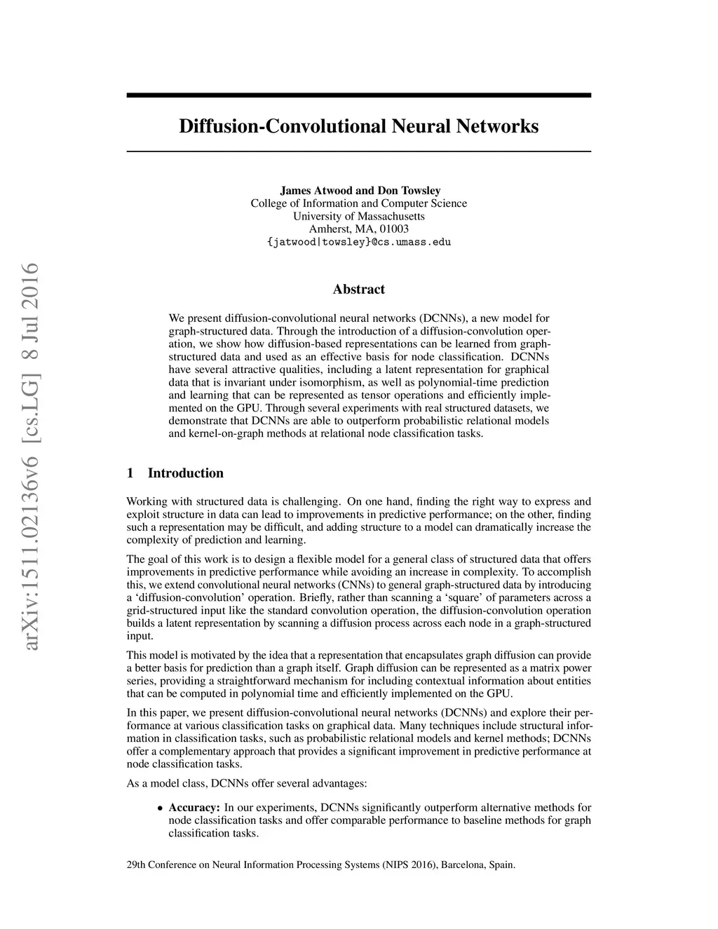 We present diffusion-convolutional neural networks (DCNNs), a new model for graph-structured data. Through the introduction of a diffusion-convolution operation, we show how diffusion-based representations can be learned from graph-structured data and used as an effective basis for node classification. DCNNs have several attractive qualities, including a latent representation for graphical data that is invariant under isomorphism, as well as polynomial-time prediction and learning that can be represented as tensor operations and efficiently implemented on the GPU. Through several experiments with real structured datasets, we demonstrate that DCNNs are able to outperform probabilistic relational models and kernel-on-graph methods at relational node classification tasks.