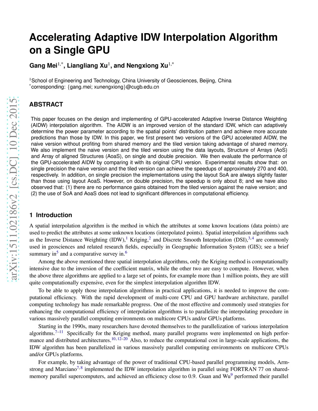 Accelerating Adaptive IDW Interpolation Algorithm on a Single GPU