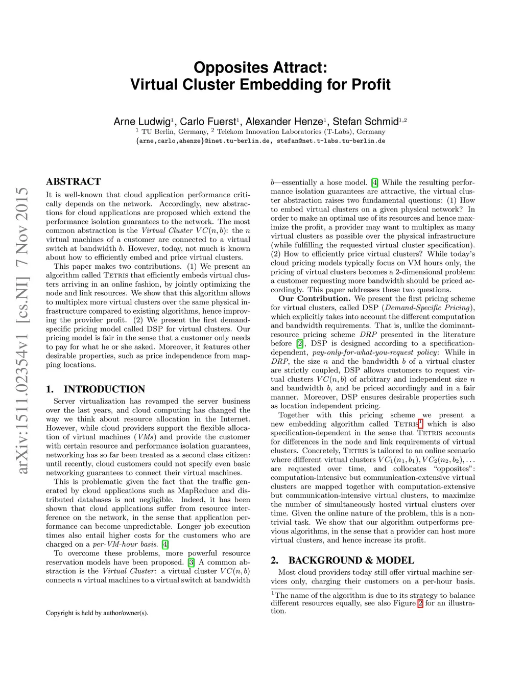 It is well-known that cloud application performance critically depends on the network. Accordingly, new abstractions for cloud applications are proposed which extend the performance isolation guarantees to the network. The most common abstraction is the Virtual Cluster V C(n, b): the n virtual machines of a customer are connected to a virtual switch at bandwidth b. However, today, not much is known about how to efficiently embed and price virtual clusters. This paper makes two contributions. (1) We present an algorithm called Tetris that efficiently embeds virtual clusters arriving in an online fashion, by jointly optimizing the node and link resources. We show that this algorithm allows to multiplex more virtual clusters over the same physical infrastructure compared to existing algorithms, hence improving the provider profit. (2) We present the first demand-specific pricing model called DSP for virtual clusters. Our pricing model is fair in the sense that a customer only needs to pay for what he or she asked. Moreover, it features other desirable properties, such as price independence from mapping locations.