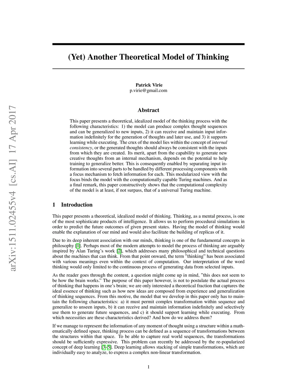 This paper presents a theoretical, idealized model of the thinking process with the following characteristics: 1) the model can produce complex thought sequences and can be generalized to new inputs, 2) it can receive and maintain input information indefinitely for the generation of thoughts and later use, and 3) it supports learning while executing. The crux of the model lies within the concept of internal consistency, or the generated thoughts should always be consistent with the inputs from which they are created. Its merit, apart from the capability to generate new creative thoughts from an internal mechanism, depends on the potential to help training to generalize better. This is consequently enabled by separating input information into several parts to be handled by different processing components with a focus mechanism to fetch information for each. This modularized view with the focus binds the model with the computationally capable Turing machines. And as a final remark, this paper constructively shows that the computational complexity of the model is at least, if not surpass, that of a universal Turing machine.