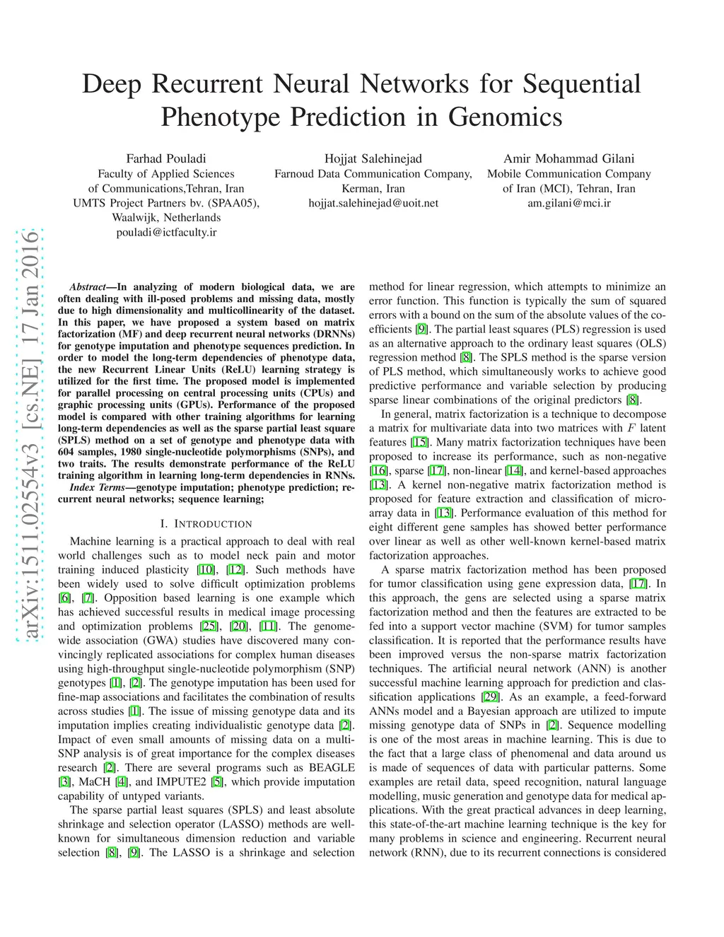 In analyzing of modern biological data, we are often dealing with ill-posed problems and missing data, mostly due to high dimensionality and multicollinearity of the dataset. In this paper, we have proposed a system based on matrix factorization (MF) and deep recurrent neural networks (DRNNs) for genotype imputation and phenotype sequences prediction. In order to model the long-term dependencies of phenotype data, the new Recurrent Linear Units (ReLU) learning strategy is utilized for the first time. The proposed model is implemented for parallel processing on central processing units (CPUs) and graphic processing units (GPUs). Performance of the proposed model is compared with other training algorithms for learning long-term dependencies as well as the sparse partial least square (SPLS) method on a set of genotype and phenotype data with 604 samples, 1980 single-nucleotide polymorphisms (SNPs), and two traits. The results demonstrate performance of the ReLU training algorithm in learning long-term dependencies in RNNs.