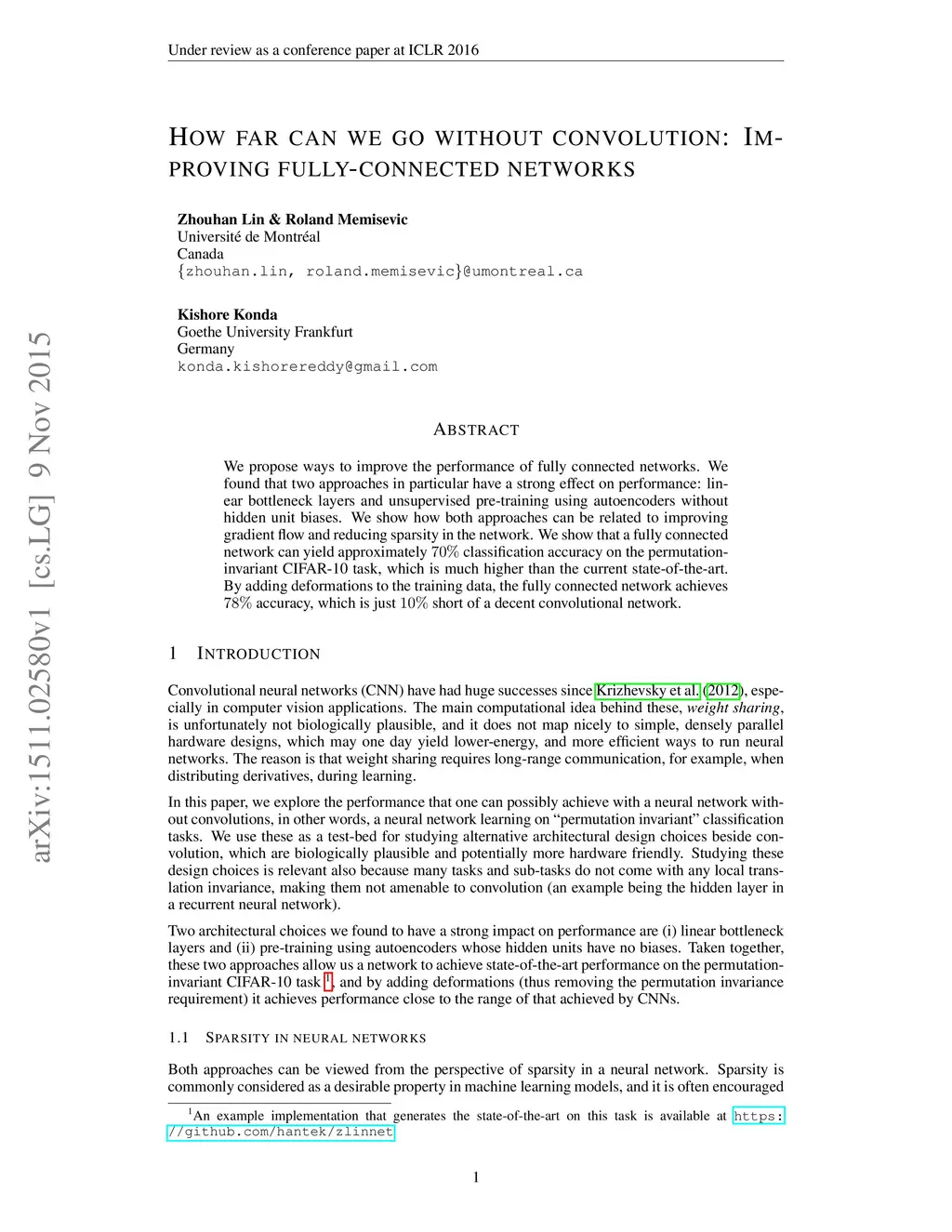 We propose ways to improve the performance of fully connected networks. We found that two approaches in particular have a strong effect on performance: linear bottleneck layers and unsupervised pre-training using autoencoders without hidden unit biases. We show how both approaches can be related to improving gradient flow and reducing sparsity in the network. We show that a fully connected network can yield approximately 70% classification accuracy on the permutation-invariant CIFAR-10 task, which is much higher than the current state-of-the-art. By adding deformations to the training data, the fully connected network achieves 78% accuracy, which is just 10% short of a decent convolutional network.