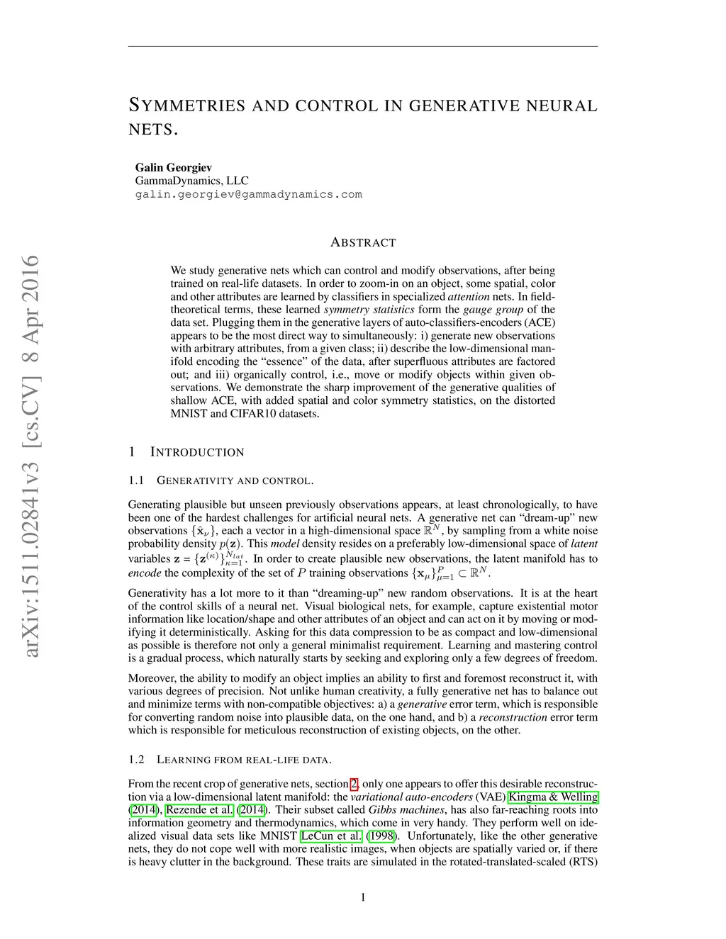 We study generative nets which can control and modify observations, after being trained on real-life datasets. In order to zoom-in on an object, some spatial, color and other attributes are learned by classifiers in specialized attention nets. In field-theoretical terms, these learned symmetry statistics form the gauge group of the data set. Plugging them in the generative layers of auto-classifiers-encoders (ACE) appears to be the most direct way to simultaneously: i) generate new observations with arbitrary attributes, from a given class, ii) describe the low-dimensional manifold encoding the "essence" of the data, after superfluous attributes are factored out, and iii) organically control, i.e., move or modify objects within given observations. We demonstrate the sharp improvement of the generative qualities of shallow ACE, with added spatial and color symmetry statistics, on the distorted MNIST and CIFAR10 datasets.