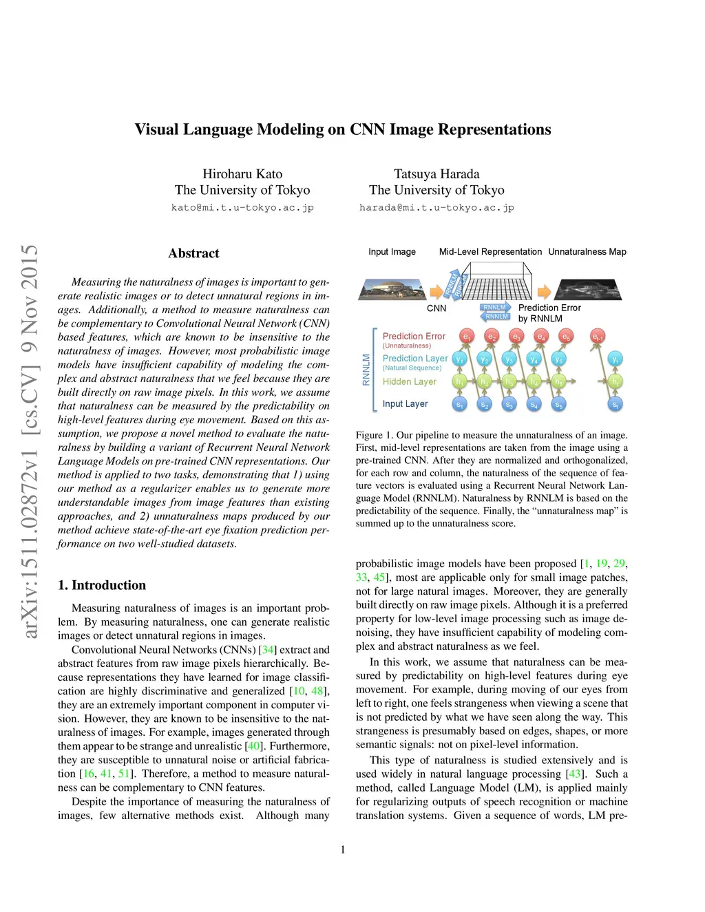 Measuring the naturalness of images is important to generate realistic images or to detect unnatural regions in images. Additionally, a method to measure naturalness can be complementary to Convolutional Neural Network (CNN) based features, which are known to be insensitive to the naturalness of images. However, most probabilistic image models have insufficient capability of modeling the complex and abstract naturalness that we feel because they are built directly on raw image pixels. In this work, we assume that naturalness can be measured by the predictability on high-level features during eye movement. Based on this assumption, we propose a novel method to evaluate the naturalness by building a variant of Recurrent Neural Network Language Models on pre-trained CNN representations. Our method is applied to two tasks, demonstrating that 1) using our method as a regularizer enables us to generate more understandable images from image features than existing approaches, and 2) unnaturalness maps produced by our method achieve state-of-the-art eye fixation prediction performance on two well-studied datasets.