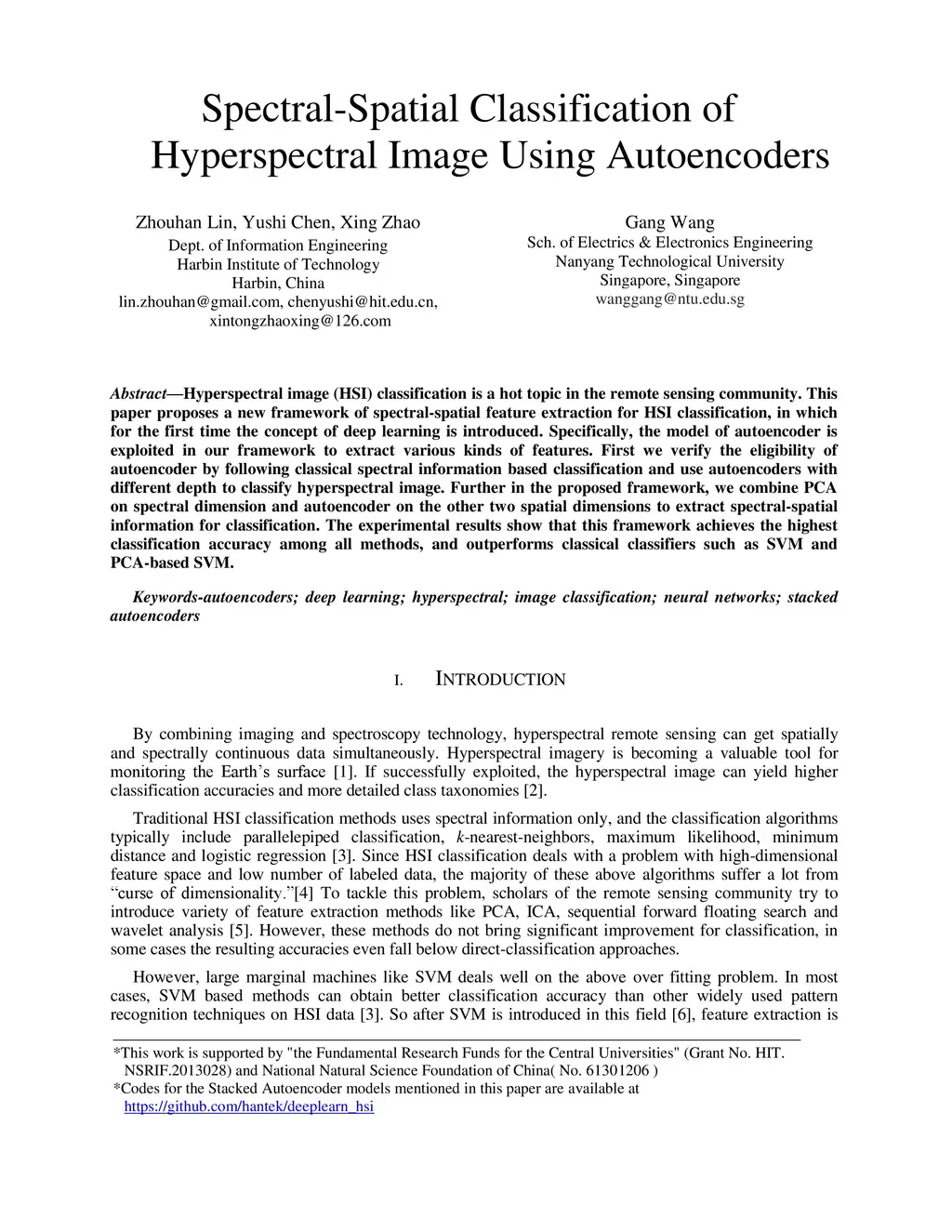 Hyperspectral image (HSI) classification is a hot topic in the remote sensing community. This paper proposes a new framework of spectral-spatial feature extraction for HSI classification, in which for the first time the concept of deep learning is introduced. Specifically, the model of autoencoder is exploited in our framework to extract various kinds of features. First we verify the eligibility of autoencoder by following classical spectral information based classification and use autoencoders with different depth to classify hyperspectral image. Further in the proposed framework, we combine PCA on spectral dimension and autoencoder on the other two spatial dimensions to extract spectral-spatial information for classification. The experimental results show that this framework achieves the highest classification accuracy among all methods, and outperforms classical classifiers such as SVM and PCA-based SVM.
