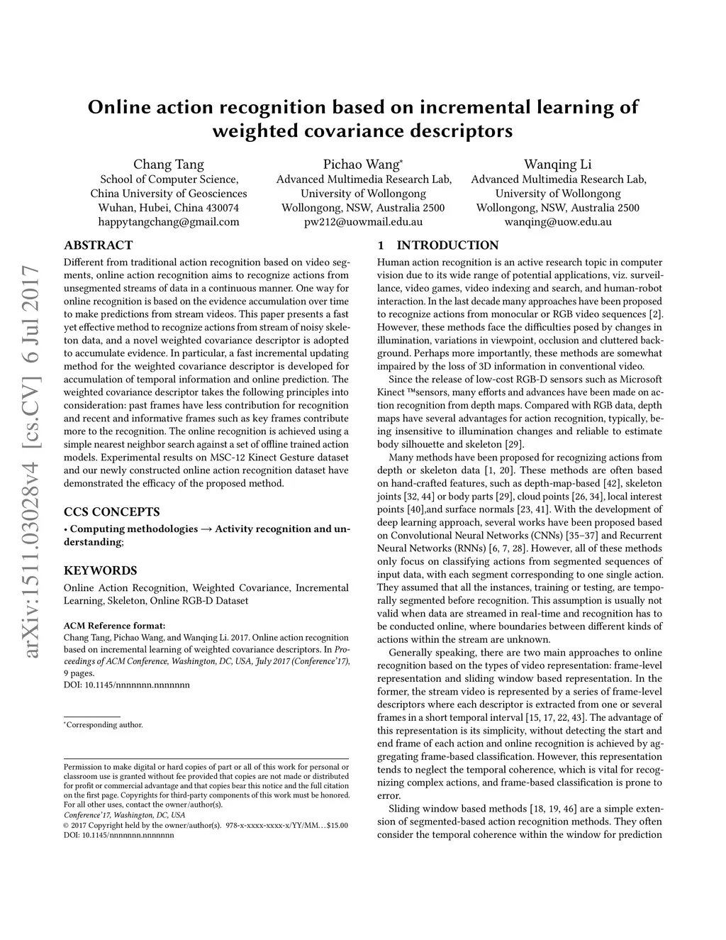 Different from traditional action recognition based on video segments, online action recognition aims to recognize actions from unsegmented streams of data in a continuous manner. One way for online recognition is based on the evidence accumulation over time to make predictions from stream videos. This paper presents a fast yet effective method to recognize actions from stream of noisy skeleton data, and a novel weighted covariance descriptor is adopted to accumulate evidence. In particular, a fast incremental updating method for the weighted covariance descriptor is developed for accumulation of temporal information and online prediction. The weighted covariance descriptor takes the following principles into consideration: past frames have less contribution for recognition and recent and informative frames such as key frames contribute more to the recognition. The online recognition is achieved using a simple nearest neighbor search against a set of offline trained action models. Experimental results on MSC-12 Kinect Gesture dataset and our newly constructed online action recognition dataset have demonstrated the efficacy of the proposed method.