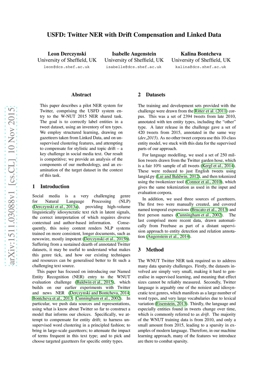This paper describes a pilot NER system for Twitter, comprising the USFD system entry to the W-NUT 2015 NER shared task. The goal is to correctly label entities in a tweet dataset, using an inventory of ten types. We employ structured learning, drawing on gazetteers taken from Linked Data, and on unsupervised clustering features, and attempting to compensate for stylistic and topic drift - a key challenge in social media text. Our result is competitive; we provide an analysis of the components of our methodology, and an examination of the target dataset in the context of this task.