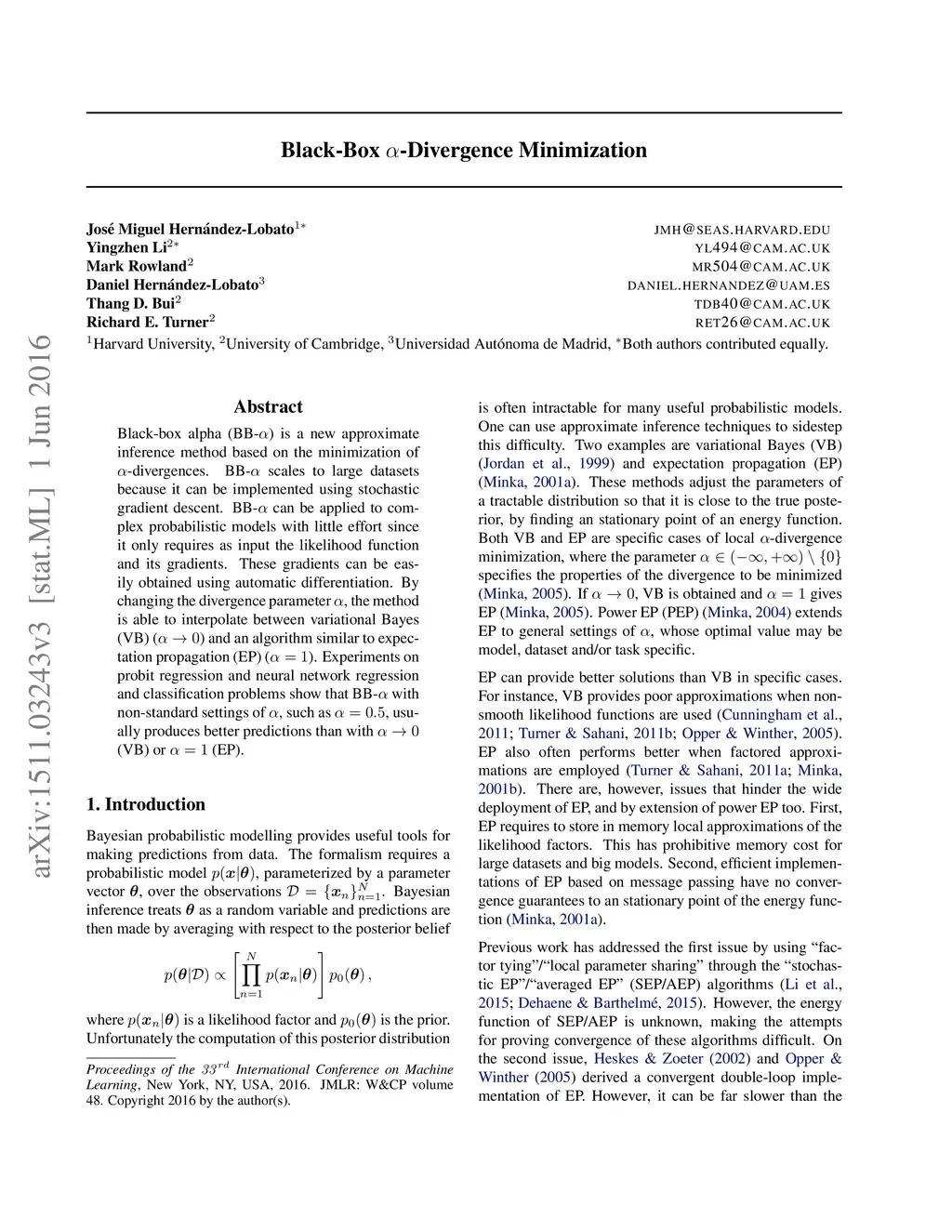 Black-box alpha (BB-) is a new approximate inference method based on the minimization of -divergences. BB- scales to large datasets because it can be implemented using stochastic gradient descent. BB- can be applied to complex probabilistic models with little effort since it only requires as input the likelihood function and its gradients. These gradients can be easily obtained using automatic differentiation. By changing the divergence parameter , the method is able to interpolate between variational Bayes (VB) () and an algorithm similar to expectation propagation (EP) (). Experiments on probit regression and neural network regression and classification problems show that BB- with non-standard settings of , such as , usually produces better predictions than with (VB) or (EP).