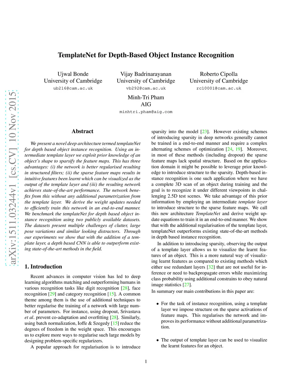 We present a novel deep architecture termed templateNet for depth based object instance recognition. Using an intermediate template layer we exploit prior knowledge of an object's shape to sparsify the feature maps. This has three advantages: (i) the network is better regularised resulting in structured filters; (ii) the sparse feature maps results in intuitive features been learnt which can be visualized as the output of the template layer and (iii) the resulting network achieves state-of-the-art performance. The network benefits from this without any additional parametrization from the template layer. We derive the weight updates needed to efficiently train this network in an end-to-end manner. We benchmark the templateNet for depth based object instance recognition using two publicly available datasets. The datasets present multiple challenges of clutter, large pose variations and similar looking distractors. Through our experiments we show that with the addition of a template layer, a depth based CNN is able to outperform existing state-of-the-art methods in the field.