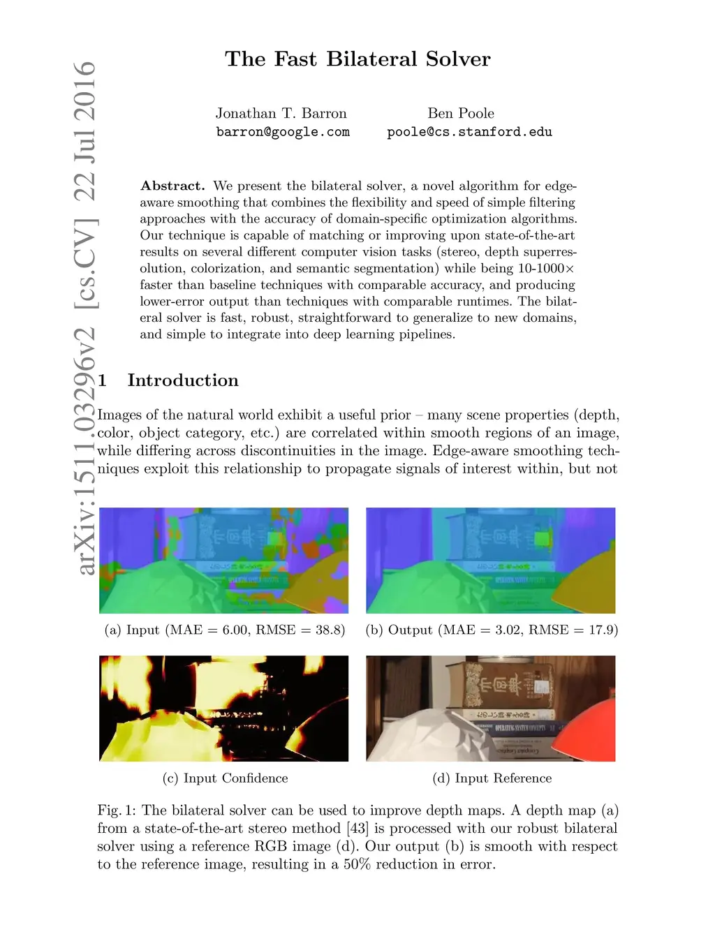 We present the bilateral solver, a novel algorithm for edge-aware smoothing that combines the flexibility and speed of simple filtering approaches with the accuracy of domain-specific optimization algorithms. Our technique is capable of matching or improving upon state-of-the-art results on several different computer vision tasks (stereo, depth superresolution, colorization, and semantic segmentation) while being 10-1000 times faster than competing approaches. The bilateral solver is fast, robust, straightforward to generalize to new domains, and simple to integrate into deep learning pipelines.