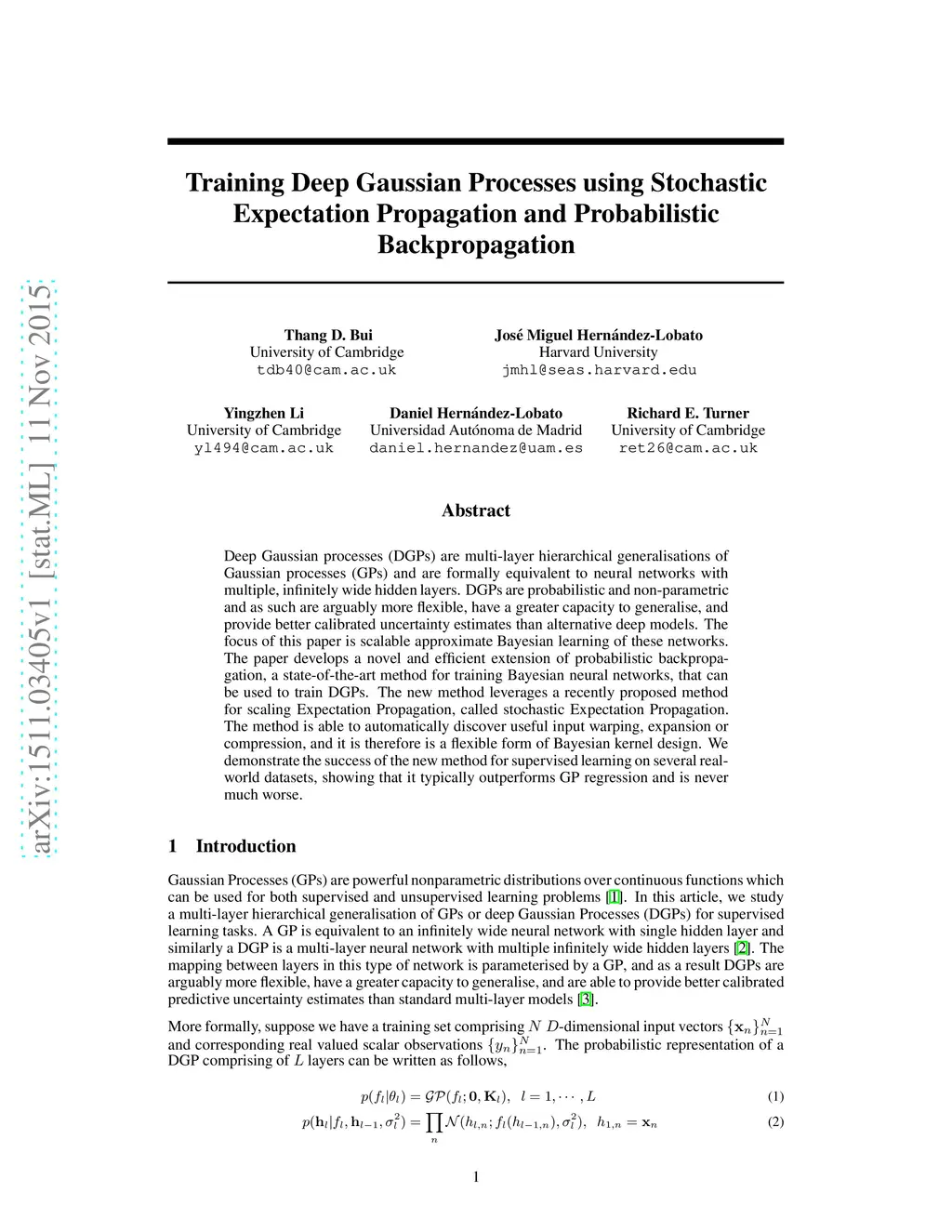 Deep Gaussian processes (DGPs) are multi-layer hierarchical generalisations of Gaussian processes (GPs) and are formally equivalent to neural networks with multiple, infinitely wide hidden layers. DGPs are probabilistic and non-parametric and as such are arguably more flexible, have a greater capacity to generalise, and provide better calibrated uncertainty estimates than alternative deep models. The focus of this paper is scalable approximate Bayesian learning of these networks. The paper develops a novel and efficient extension of probabilistic backpropagation, a state-of-the-art method for training Bayesian neural networks, that can be used to train DGPs. The new method leverages a recently proposed method for scaling Expectation Propagation, called stochastic Expectation Propagation. The method is able to automatically discover useful input warping, expansion or compression, and it is therefore is a flexible form of Bayesian kernel design. We demonstrate the success of the new method for supervised learning on several real-world datasets, showing that it typically outperforms GP regression and is never much worse.