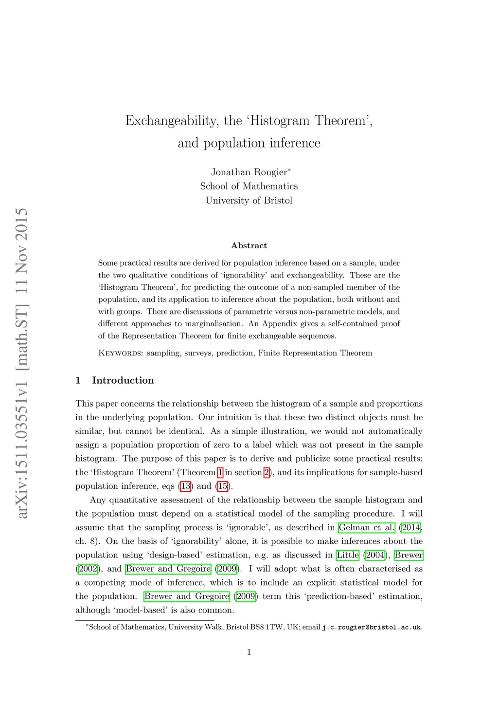 Some practical results are derived for population inference based on a sample, under the two qualitative conditions of ígnorability' and exchangeability. These are the 'Histogram Theorem', for predicting the outcome of a non-sampled member of the population, and its application to inference about the population, both without and with groups. There are discussions of parametric versus non-parametric models, and different approaches to marginalisation. An Appendix gives a self-contained proof of the Representation Theorem for finite exchangeable sequences.