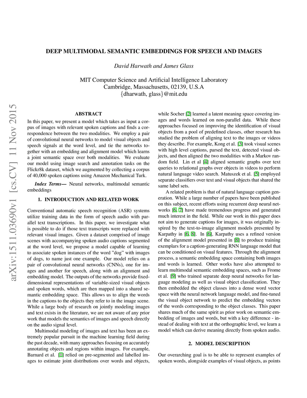 In this paper, we present a model which takes as input a corpus of images with relevant spoken captions and finds a correspondence between the two modalities. We employ a pair of convolutional neural networks to model visual objects and speech signals at the word level, and tie the networks together with an embedding and alignment model which learns a joint semantic space over both modalities. We evaluate our model using image search and annotation tasks on the Flickr8k dataset, which we augmented by collecting a corpus of 40,000 spoken captions using Amazon Mechanical Turk.