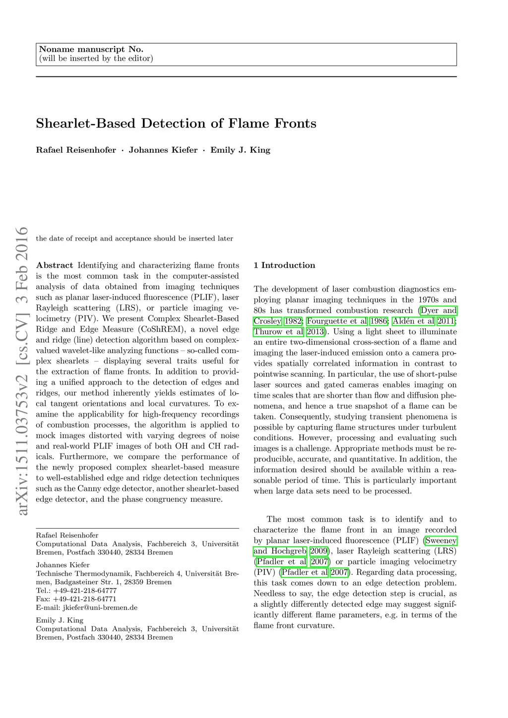 Shearlet-Based Detection of Flame Fronts