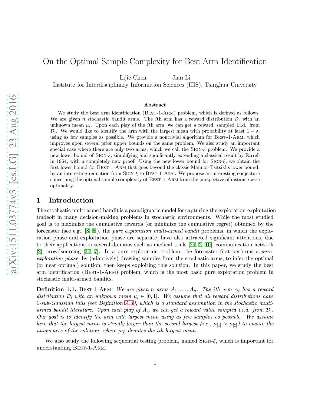 We study the best arm identification (BEST-1-ARM) problem, which is defined as follows. We are given stochastic bandit arms. The th arm has a reward distribution with an unknown mean . Upon each play of the th arm, we can get a reward, sampled i.i.d. from . We would like to identify the arm with the largest mean with probability at least , using as few samples as possible. We provide a nontrivial algorithm for BEST-1-ARM, which improves upon several prior upper bounds on the same problem. We also study an important special case where there are only two arms, which we call the sign problem. We provide a new lower bound of sign, simplifying and significantly extending a classical result by Farrell in 1964, with a completely new proof. Using the new lower bound for sign, we obtain the first lower bound for BEST-1-ARM that goes beyond the classic Mannor-Tsitsiklis lower bound, by an interesting reduction from Sign to BEST-1-ARM. We propose an interesting conjecture concerning the optimal sample complexity of BEST-1-ARM from the perspective of instance-wise optimality.