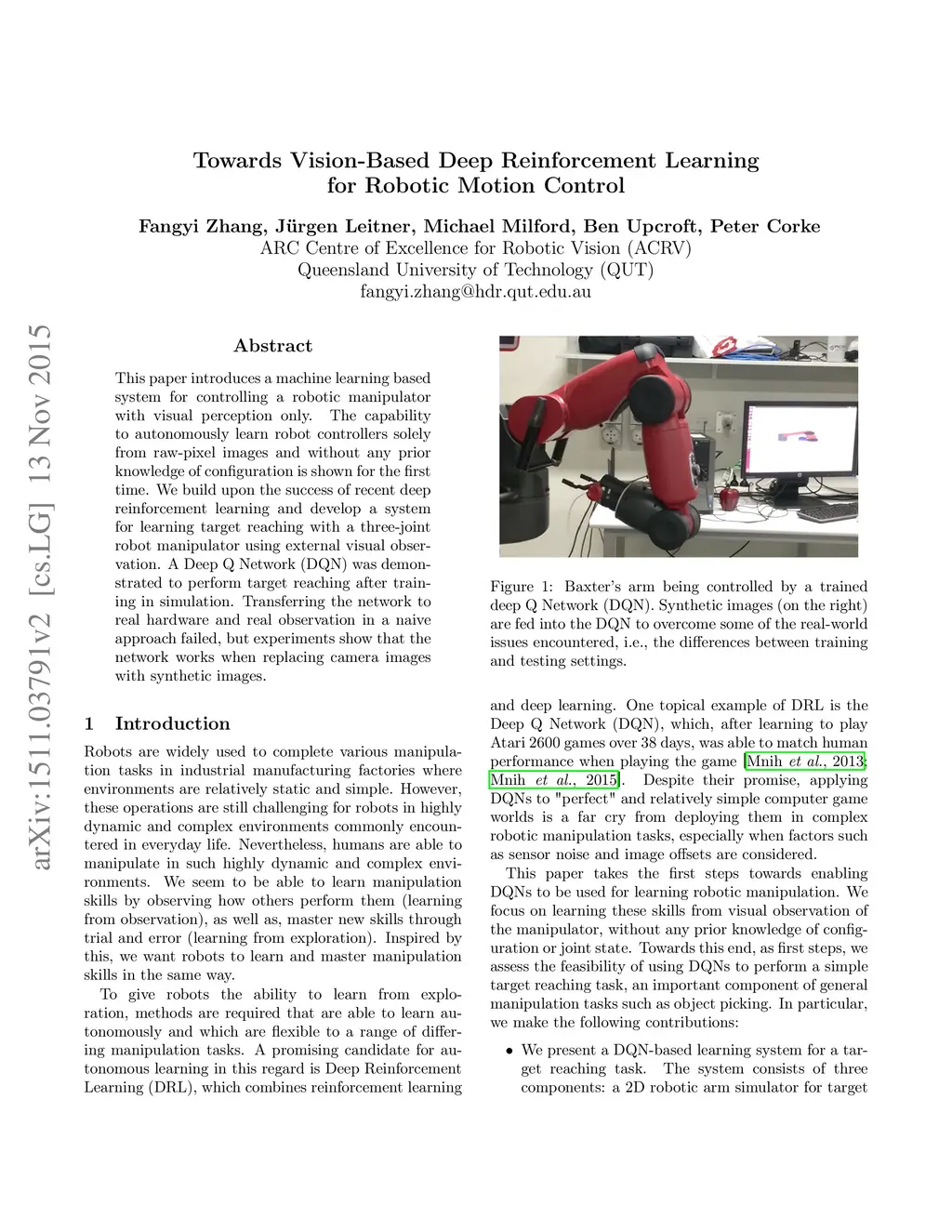Towards Vision-Based Deep Reinforcement Learning for Robotic Motion