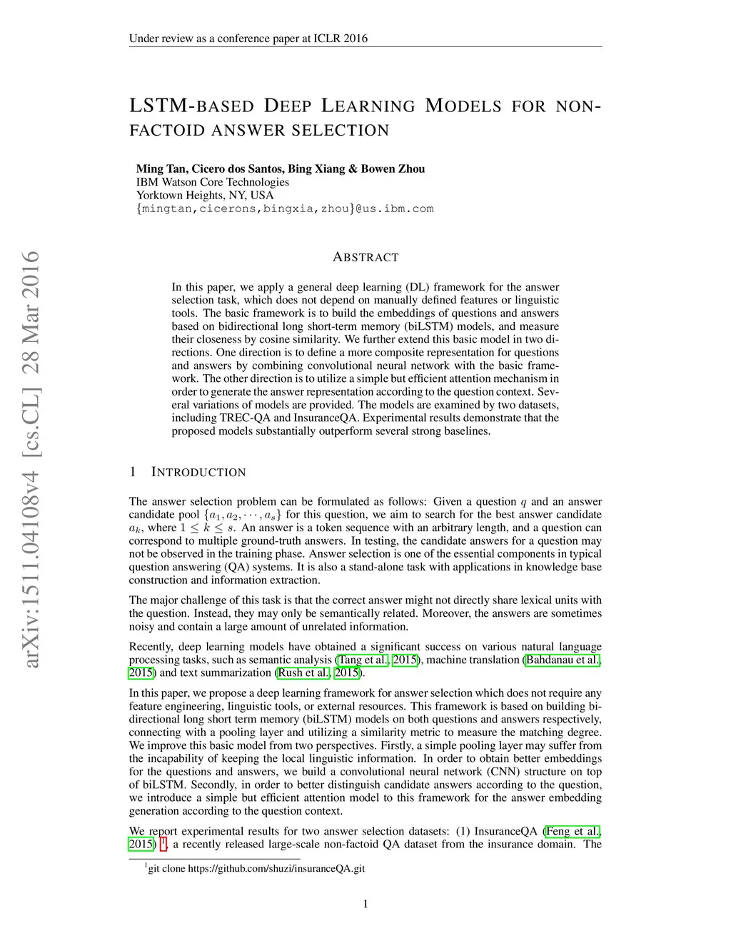 LSTM-based Deep Learning Models for Non-factoid Answer Selection