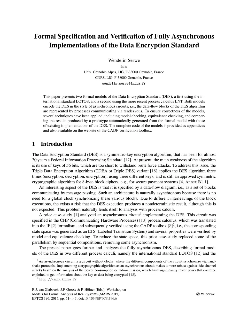 This paper presents two formal models of the Data Encryption Standard (DES), a first using the international standard LOTOS, and a second using the more recent process calculus LNT. Both models encode the DES in the style of asynchronous circuits, i.e., the data-flow blocks of the DES algorithm are represented by processes communicating via rendezvous. To ensure correctness of the models, several techniques have been applied, including model checking, equivalence checking, and comparing the results produced by a prototype automatically generated from the formal model with those of existing implementations of the DES. The complete code of the models is provided as appendices and also available on the website of the CADP verification toolbox.