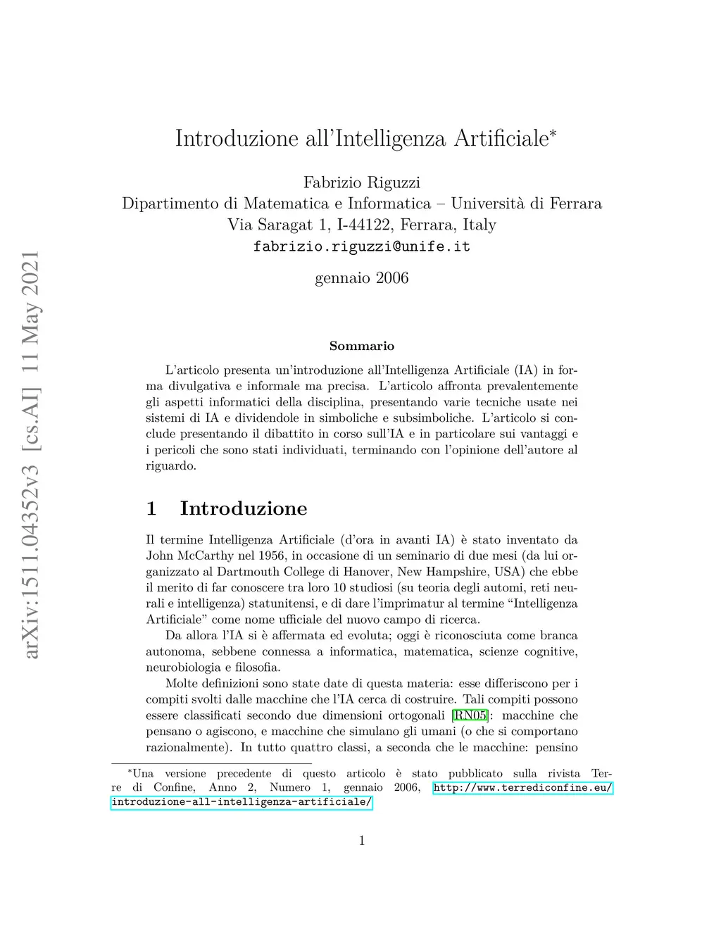 The paper presents an introduction to Artificial Intelligence (AI) in an accessible and informal but precise form. The paper focuses on the algorithmic aspects of the discipline, presenting the main techniques used in AI systems groped in symbolic and subsymbolic. The last part of the paper is devoted to the discussion ongoing among experts in the field and the public at large about on the advantages and disadvantages of AI and in particular on the possible dangers. The personal opinion of the author on this subject concludes the paper. -- -- Lárticolo presenta uníntroduzione allÍntelligenza Artificiale (IA) in forma divulgativa e informale ma precisa. Lárticolo affronta prevalentemente gli aspetti informatici della disciplina, presentando le principali tecniche usate nei sistemi di IA divise in simboliche e subsimboliche. Lúltima parte dellárticolo presenta il dibattito in corso tra gli esperi e il pubblico su vantaggi e svantaggi dellÍA e in particolare sui possibili pericoli. Lárticolo termina con lópinione delláutore al riguardo.