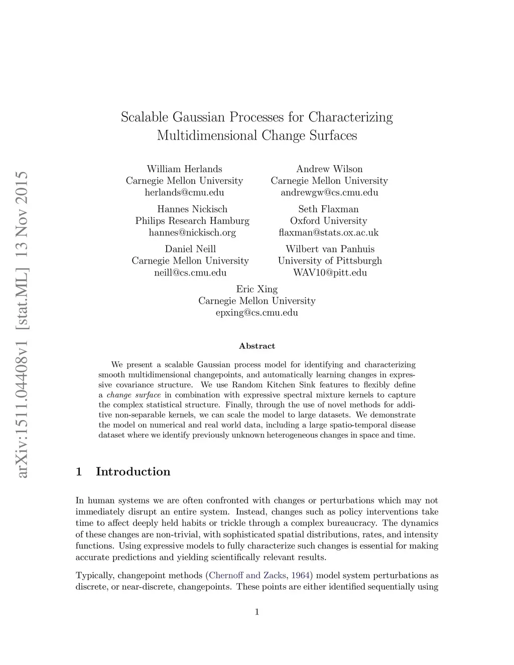 We present a scalable Gaussian process model for identifying and characterizing smooth multidimensional changepoints, and automatically learning changes in expressive covariance structure. We use Random Kitchen Sink features to flexibly define a change surface in combination with expressive spectral mixture kernels to capture the complex statistical structure. Finally, through the use of novel methods for additive non-separable kernels, we can scale the model to large datasets. We demonstrate the model on numerical and real world data, including a large spatio-temporal disease dataset where we identify previously unknown heterogeneous changes in space and time.