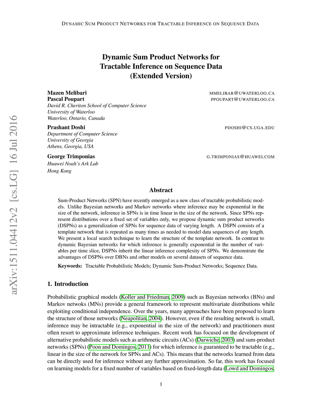 Dynamic Sum Product Networks for Tractable Inference on Sequence Data