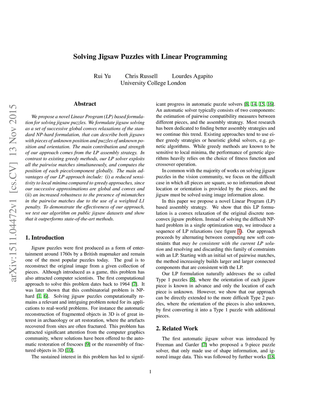 We propose a novel Linear Program (LP) based formula- tion for solving jigsaw puzzles. We formulate jigsaw solving as a set of successive global convex relaxations of the stan- dard NP-hard formulation, that can describe both jigsaws with pieces of unknown position and puzzles of unknown po- sition and orientation. The main contribution and strength of our approach comes from the LP assembly strategy. In contrast to existing greedy methods, our LP solver exploits all the pairwise matches simultaneously, and computes the position of each piece/component globally. The main ad- vantages of our LP approach include: (i) a reduced sensi- tivity to local minima compared to greedy approaches, since our successive approximations are global and convex and (ii) an increased robustness to the presence of mismatches in the pairwise matches due to the use of a weighted L1 penalty. To demonstrate the effectiveness of our approach, we test our algorithm on public jigsaw datasets and show that it outperforms state-of-the-art methods.