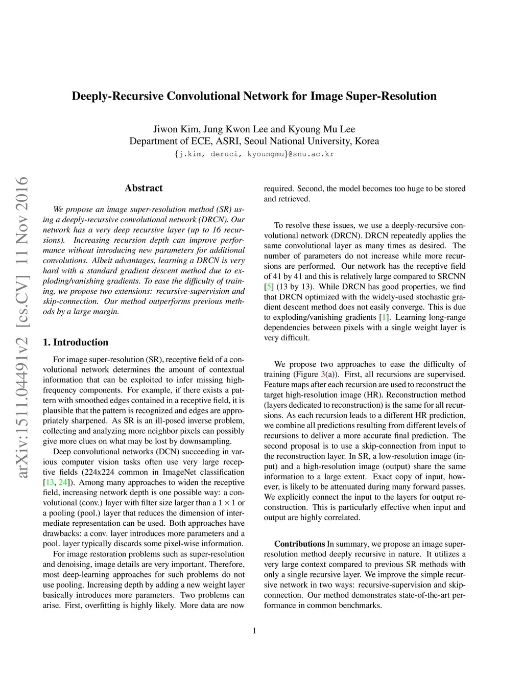 We propose an image super-resolution method (SR) using a deeply-recursive convolutional network (DRCN). Our network has a very deep recursive layer (up to 16 recursions). Increasing recursion depth can improve performance without introducing new parameters for additional convolutions. Albeit advantages, learning a DRCN is very hard with a standard gradient descent method due to exploding/vanishing gradients. To ease the difficulty of training, we propose two extensions: recursive-supervision and skip-connection. Our method outperforms previous methods by a large margin.
