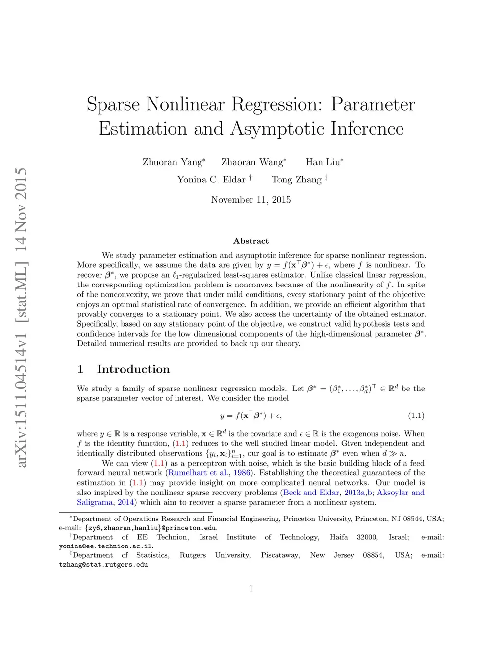 We study parameter estimation and asymptotic inference for sparse nonlinear regression. More specifically, we assume the data are given by , where is nonlinear. To recover , we propose an -regularized least-squares estimator. Unlike classical linear regression, the corresponding optimization problem is nonconvex because of the nonlinearity of . In spite of the nonconvexity, we prove that under mild conditions, every stationary point of the objective enjoys an optimal statistical rate of convergence. In addition, we provide an efficient algorithm that provably converges to a stationary point. We also access the uncertainty of the obtained estimator. Specifically, based on any stationary point of the objective, we construct valid hypothesis tests and confidence intervals for the low dimensional components of the high-dimensional parameter . Detailed numerical results are provided to back up our theory.