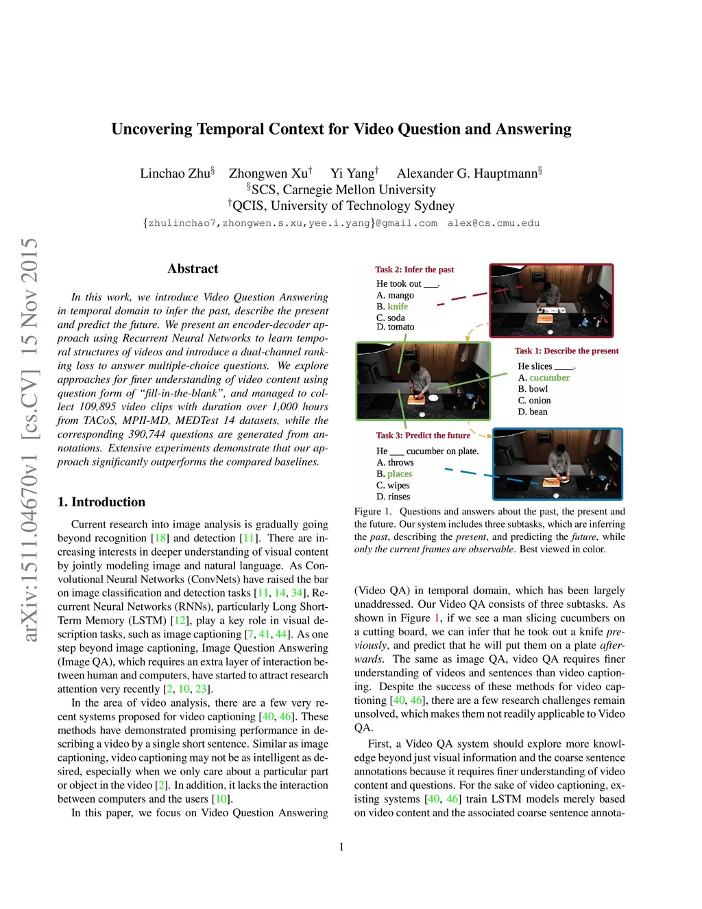 In this work, we introduce Video Question Answering in temporal domain to infer the past, describe the present and predict the future. We present an encoder-decoder approach using Recurrent Neural Networks to learn temporal structures of videos and introduce a dual-channel ranking loss to answer multiple-choice questions. We explore approaches for finer understanding of video content using question form of "fill-in-the-blank", and managed to collect 109,895 video clips with duration over 1,000 hours from TACoS, MPII-MD, MEDTest 14 datasets, while the corresponding 390,744 questions are generated from annotations. Extensive experiments demonstrate that our approach significantly outperforms the compared baselines.