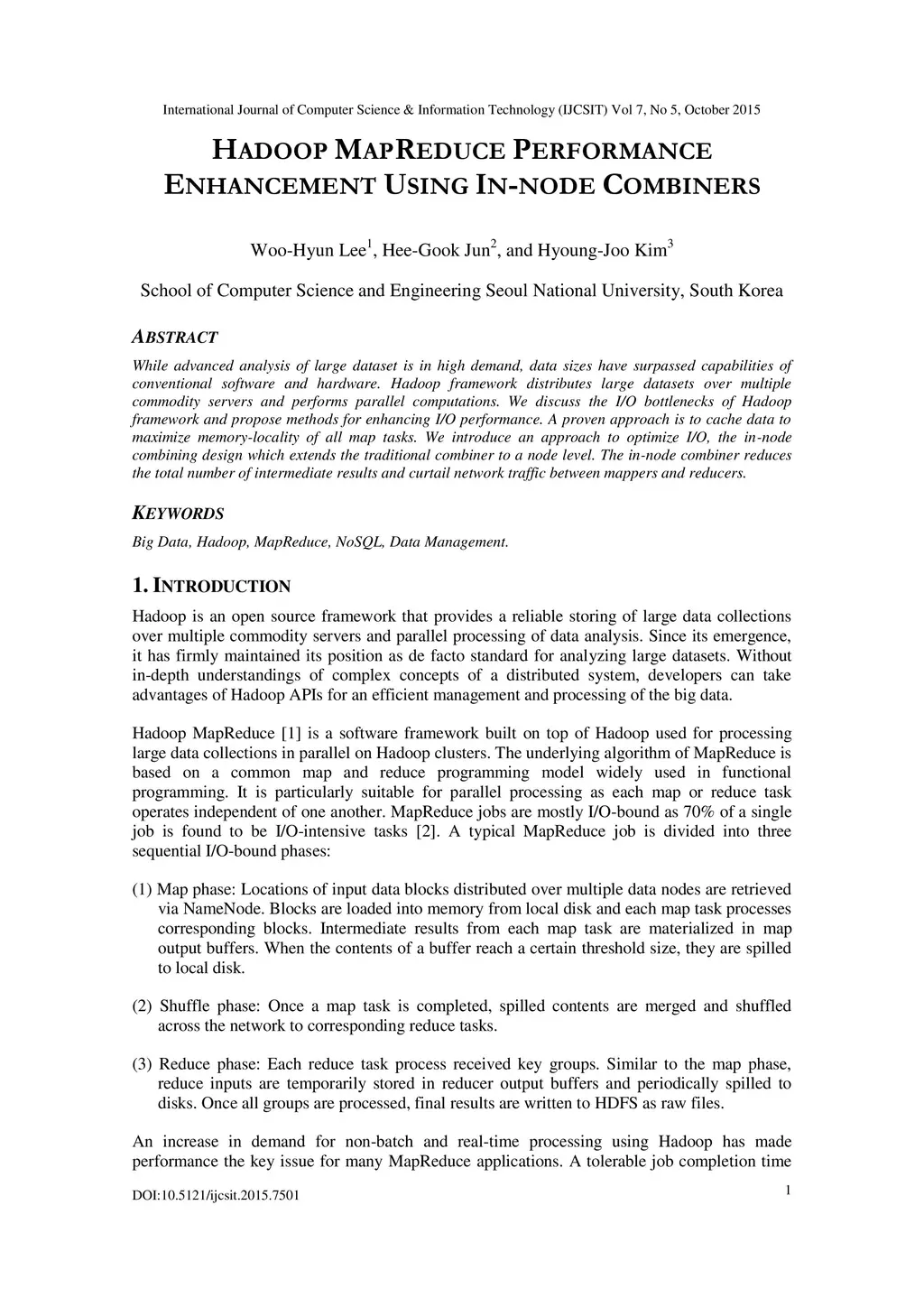 While advanced analysis of large dataset is in high demand, data sizes have surpassed capabilities of conventional software and hardware. Hadoop framework distributes large datasets over multiple commodity servers and performs parallel computations. We discuss the I/O bottlenecks of Hadoop framework and propose methods for enhancing I/O performance. A proven approach is to cache data to maximize memory-locality of all map tasks. We introduce an approach to optimize I/O, the in-node combining design which extends the traditional combiner to a node level. The in-node combiner reduces the total number of intermediate results and curtail network traffic between mappers and reducers.